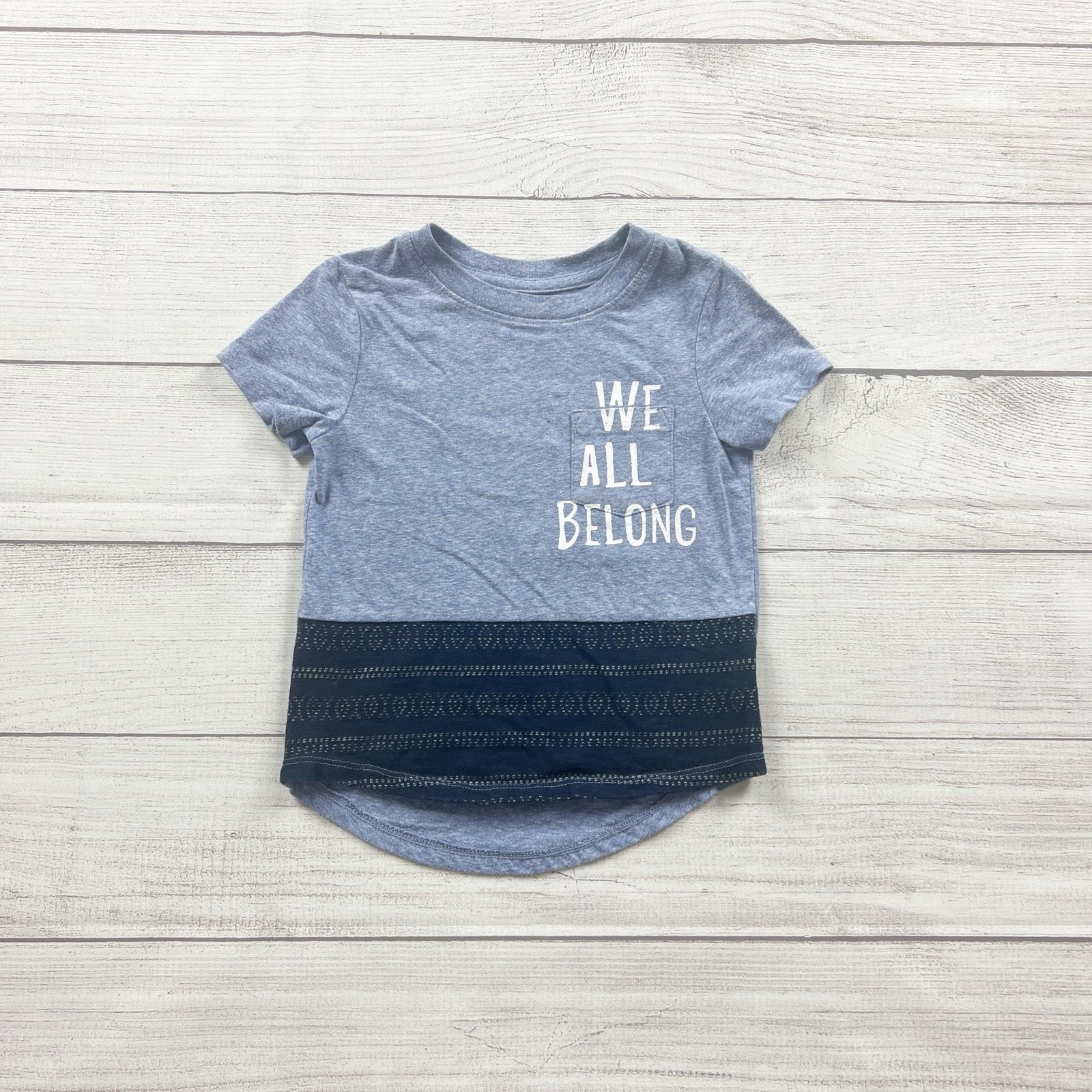 Cat and Jack t-shirt, toddler boy shirt 2T, we all belong shirt, blue graphic tee toddler, kids inclusive message shirt, short sleeve toddler tee, casual toddler top, pocket t-shirt toddler, gently used kids clothing, sustainable kids clothes, recycled polyester kids shirt