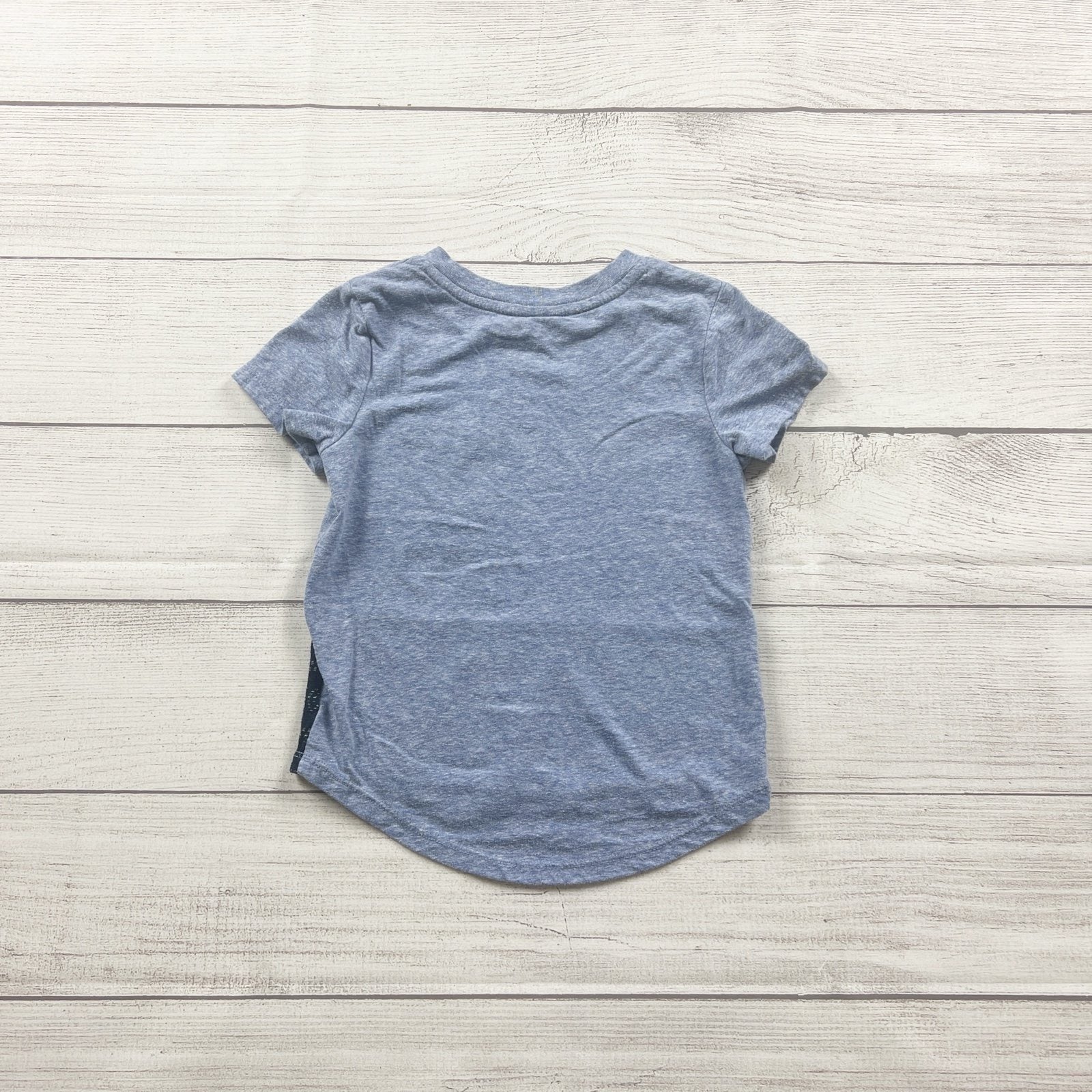 Cat & Jack toddler short sleeve t-shirt in size 2T in a heather blue color featuring “WE ALL BELONG” text on the chest pocket area and a darker blue patterned hem panel. Soft cotton blend with recycled polyester and a comfortable everyday fit—great for school, play, and casual outfits.