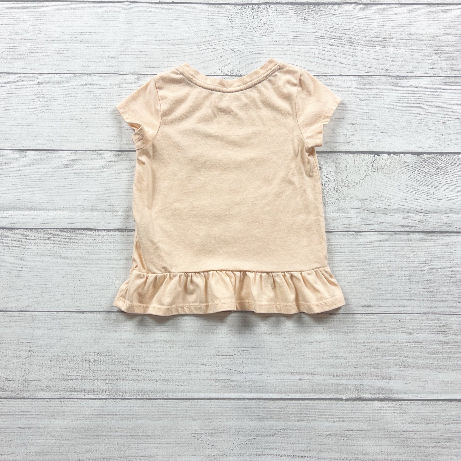 Cat & Jack toddler girl short sleeve top in size 3T. Soft peach shirt with a “Smart Lil Apple” apple graphic and a cute ruffle hem. Easy everyday piece for back-to-school outfits, fall layering, and play.