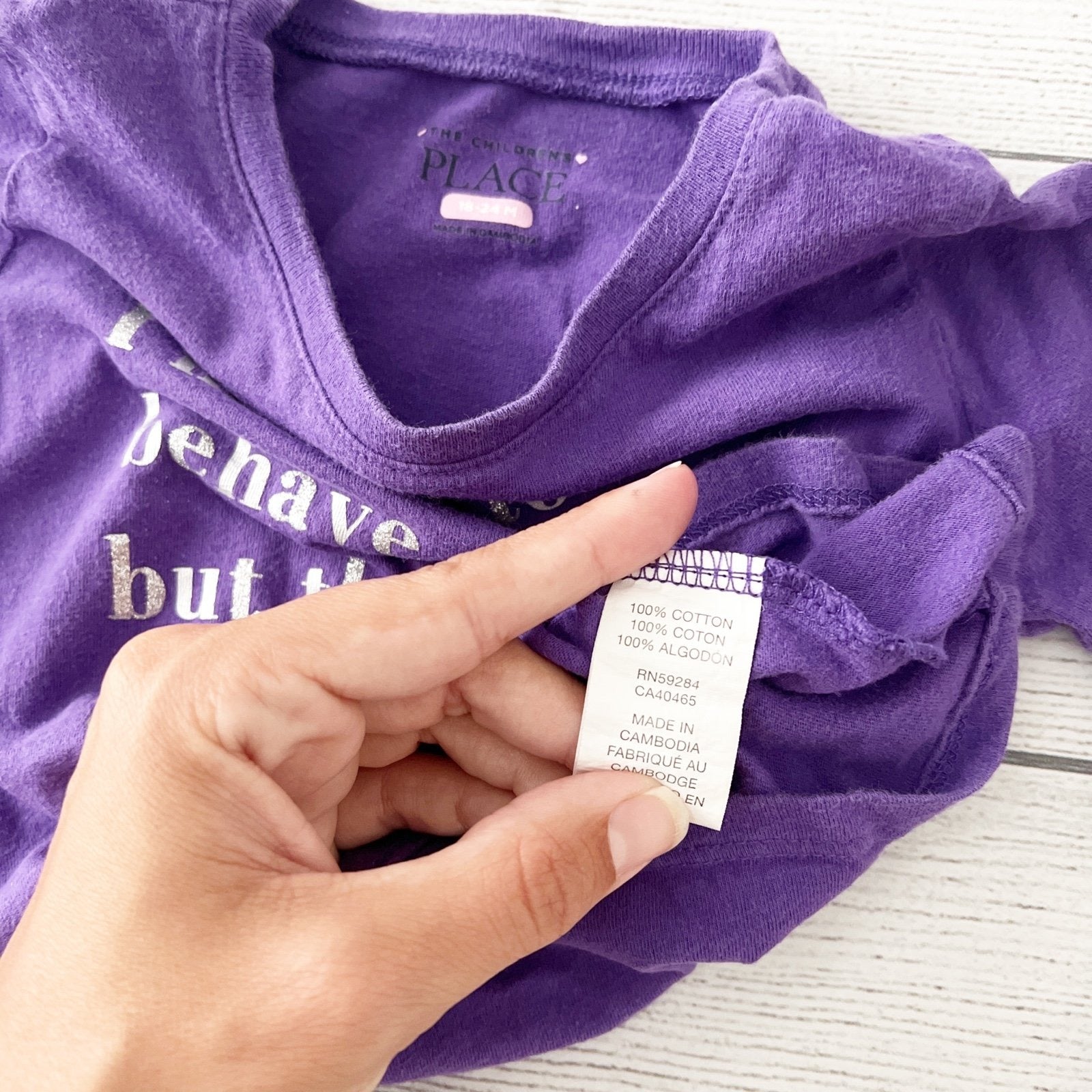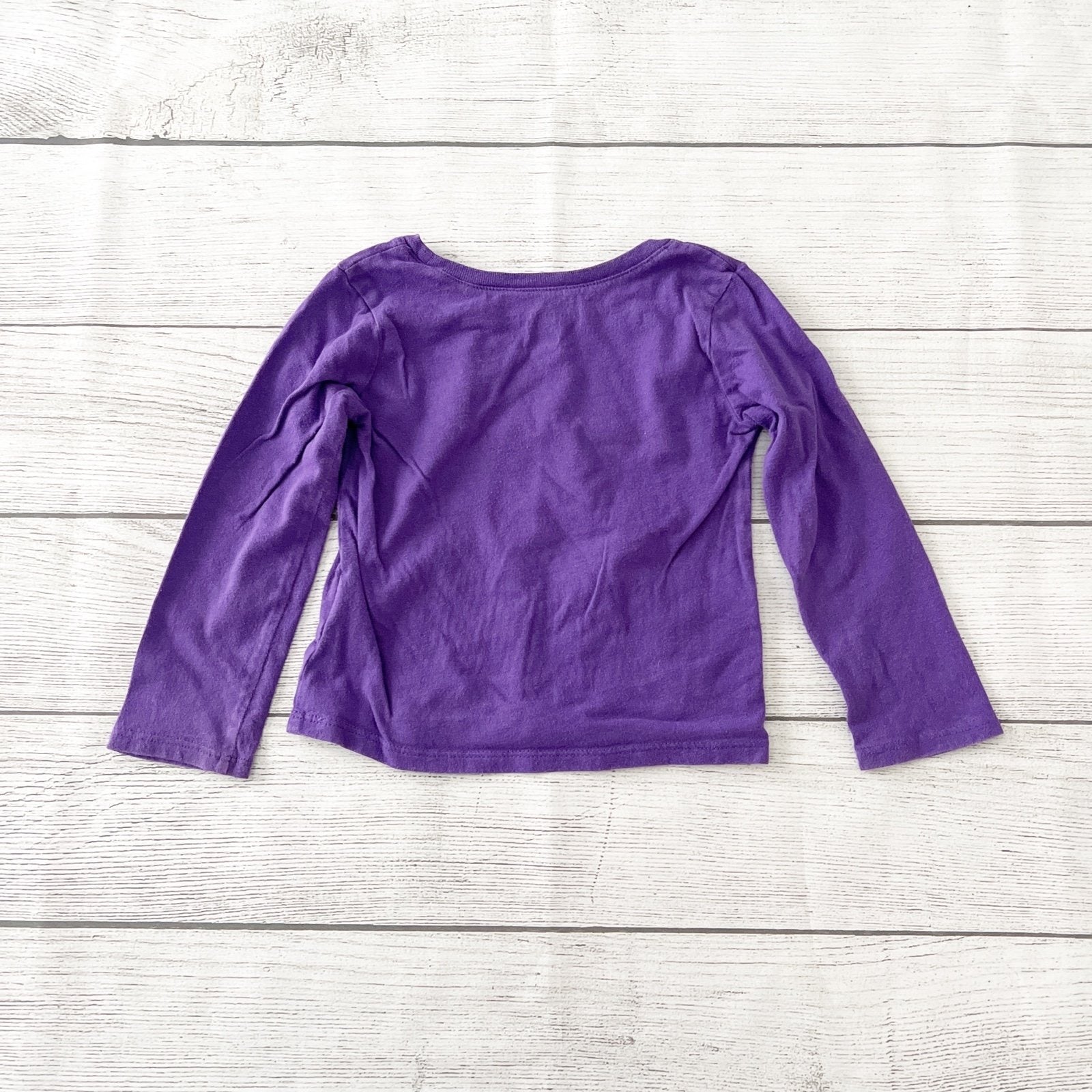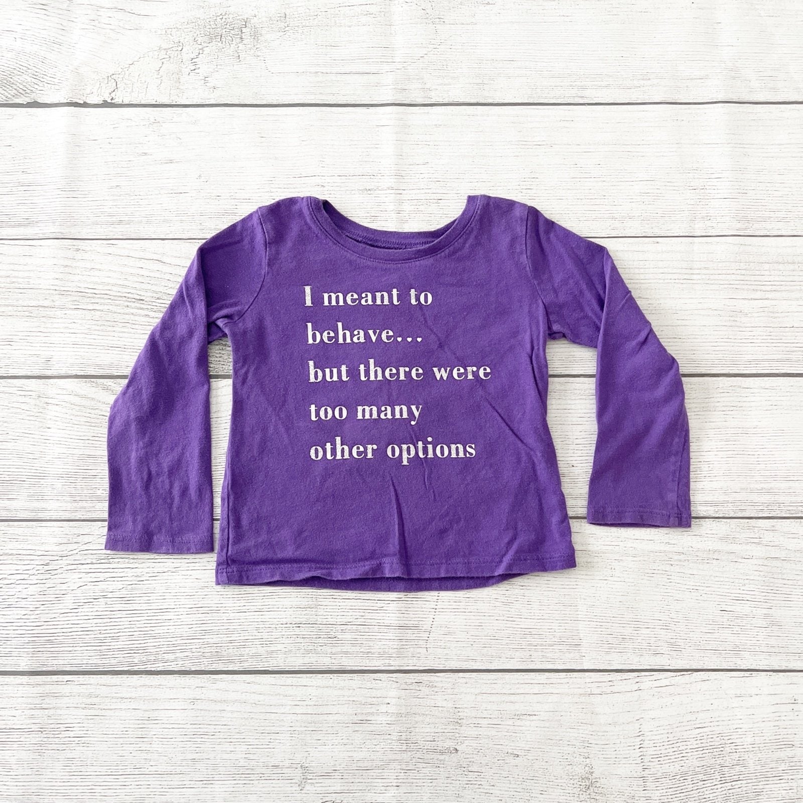 Purple long sleeve shirt with “I meant to behave… but there were too many other options” in silver glitter.
