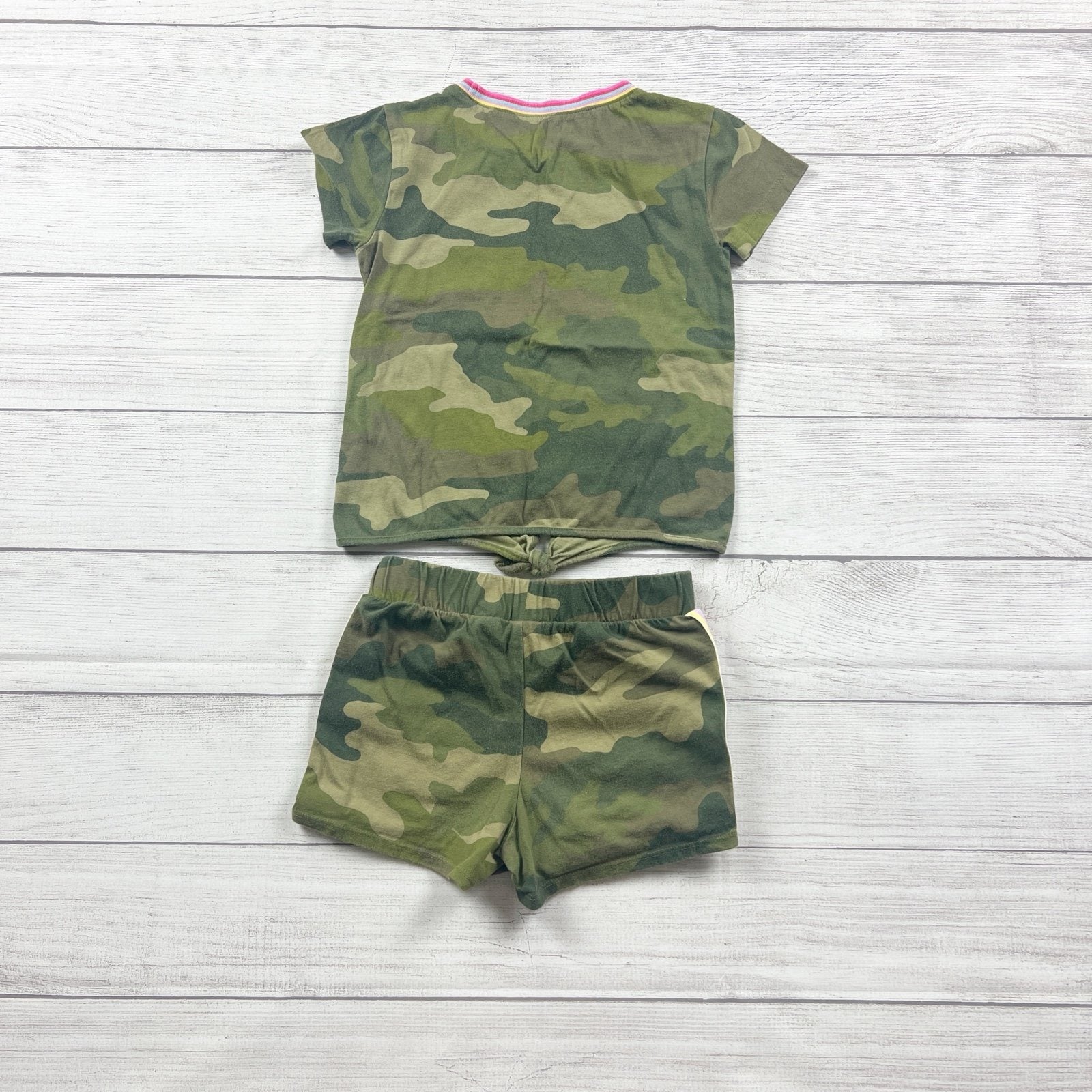 Crewcuts girls 2-piece outfit set in size Small (6-7) featuring a green camo short sleeve top and matching shorts with colorful rainbow stripe trim. The top has a cute knotted hem detail for an easy, trendy look, and the shorts have an elastic waistband for a comfortable fit. Perfect for summer outfits, vacations, playdates, and everyday wear. Gently used in great condition.