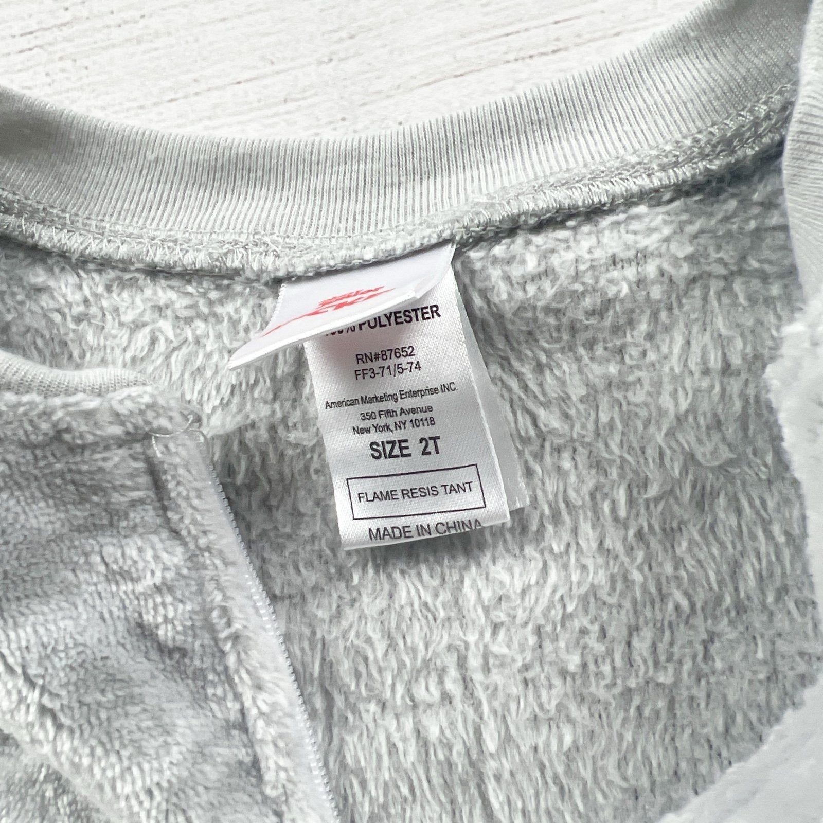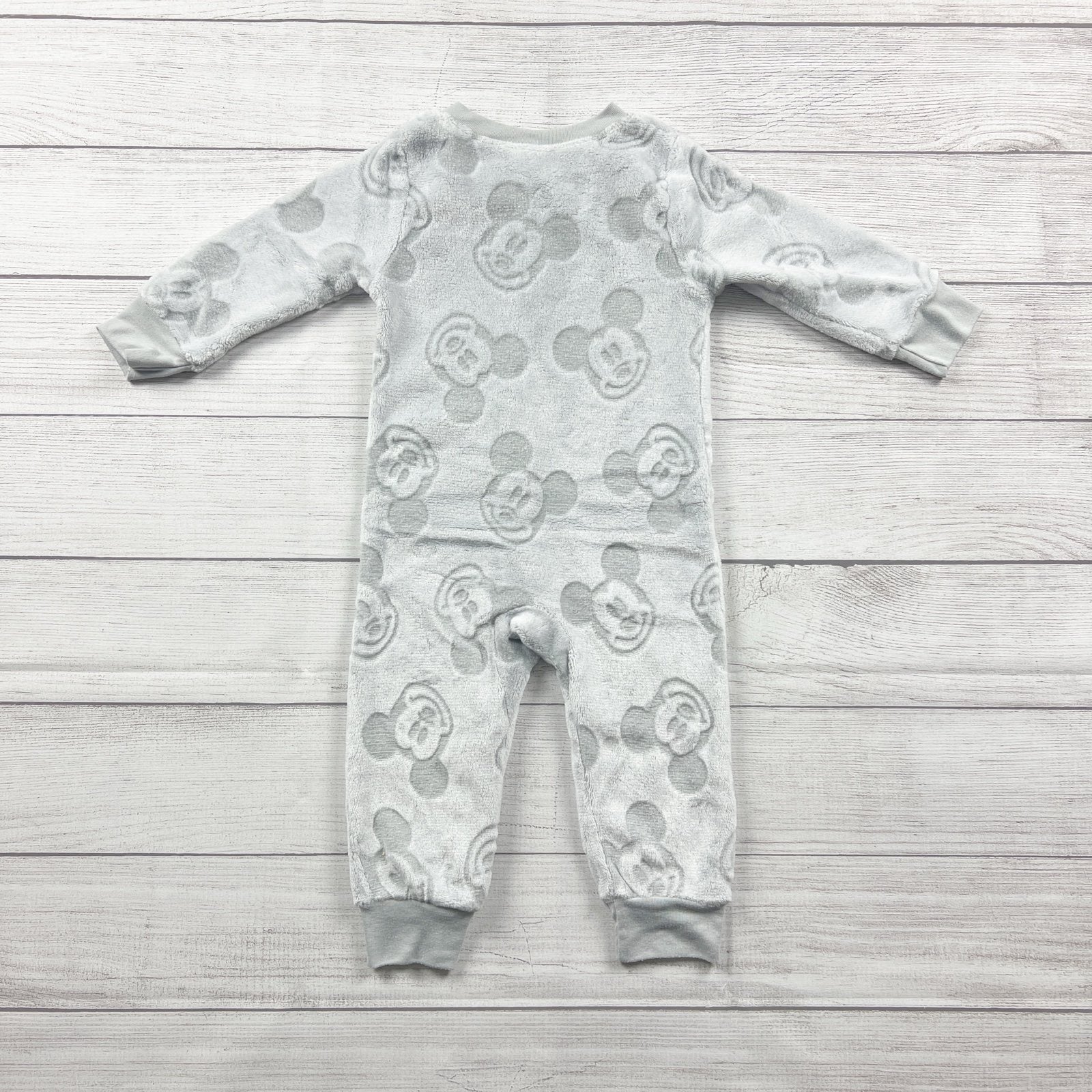Disney baby/toddler one-piece sleeper pajamas in size 2T in soft gray fleece with an allover Mickey Mouse face print. Full front zipper for easy changes, long sleeves, and cuffed ankles (footless style). Cozy and warm for bedtime, naps, or lounging. Flame resistant (per tag).