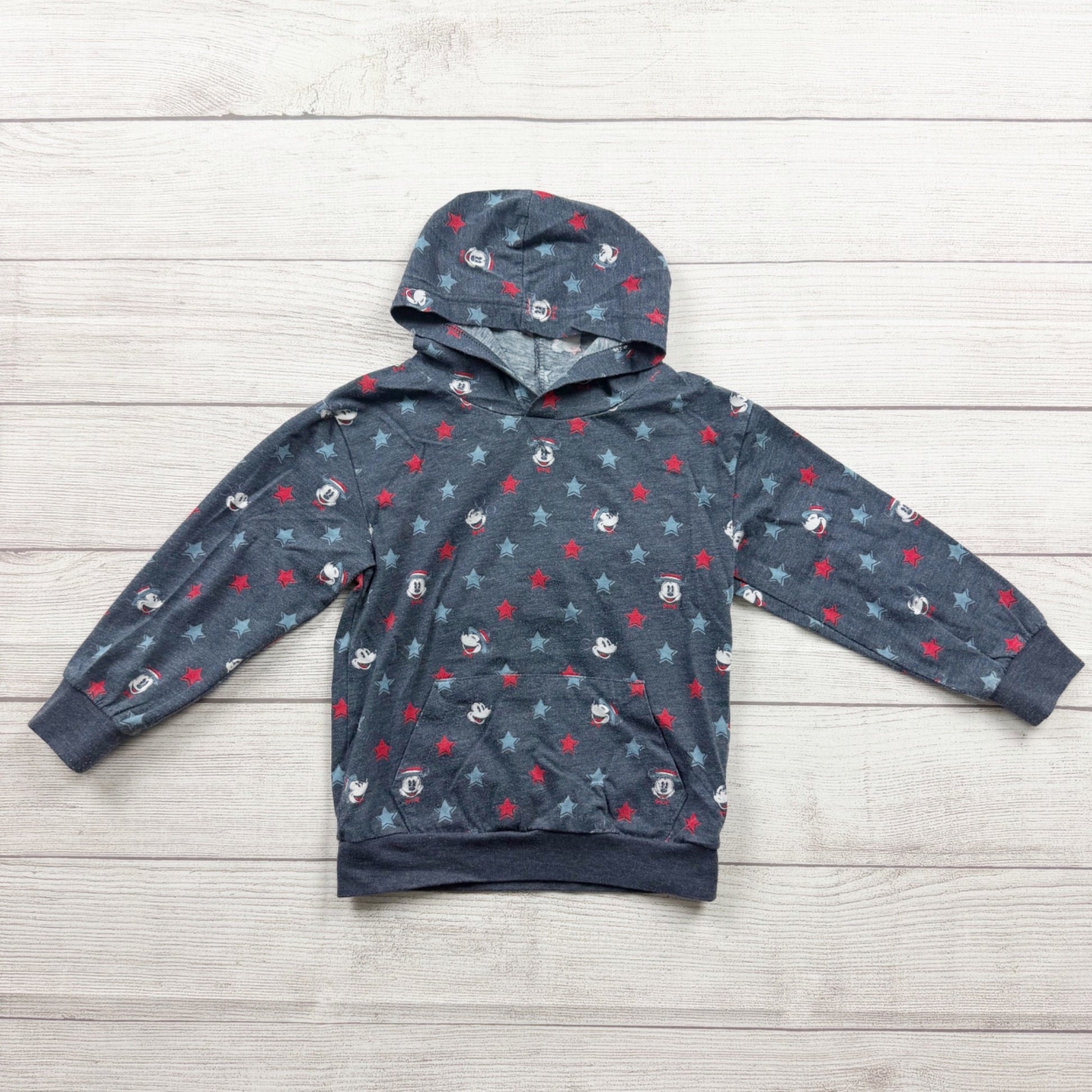 Disney kids pullover hoodie in size XS (4). Blue hoodie with an allover red and blue star print and Mickey Mouse faces throughout. Cozy hooded style with a front kangaroo pocket and ribbed cuffs/hem. Comfortable cotton blend fabric, great for school, play, layering, and 4th of July outfits. Gently used condition.