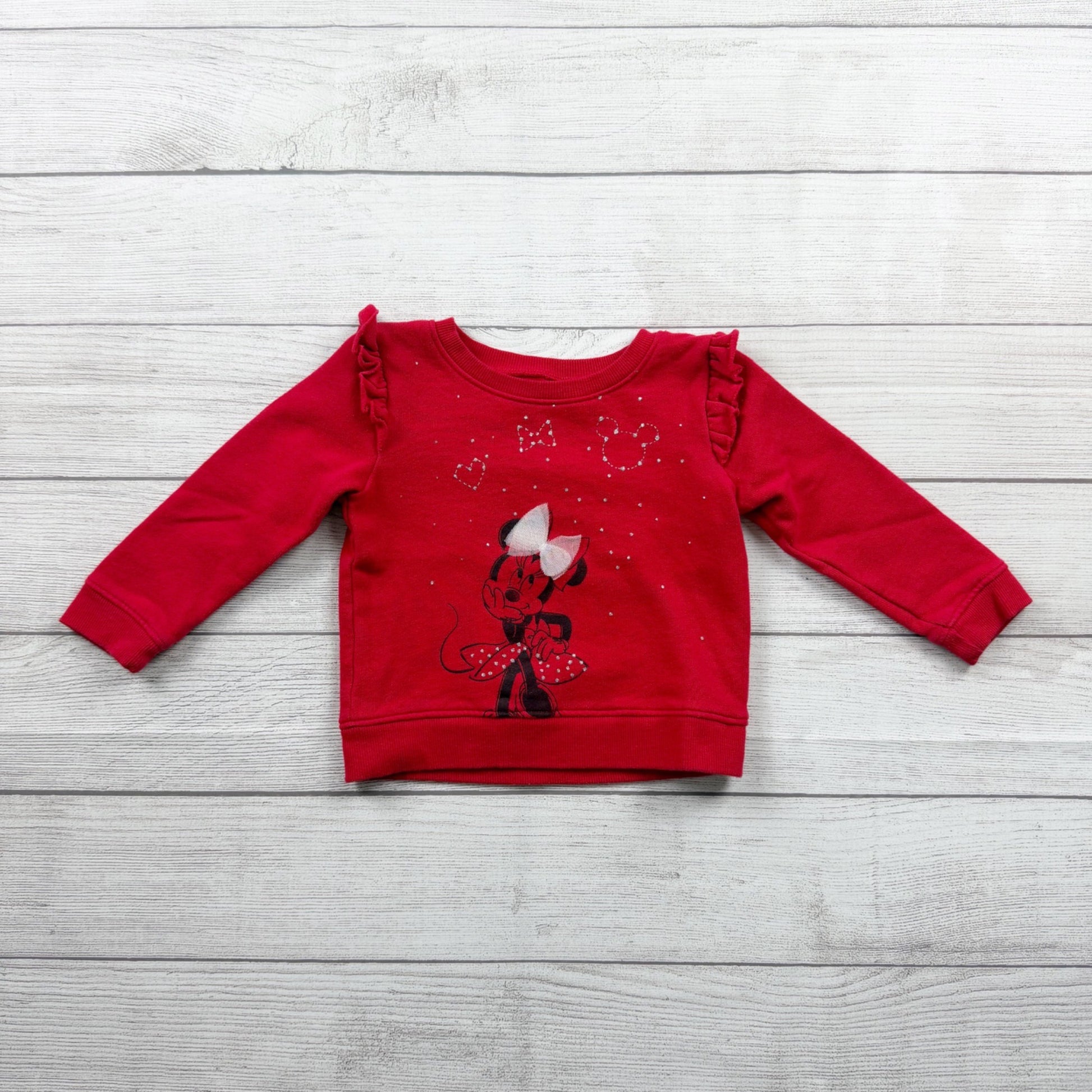 Disney toddler sweatshirt in size 2T featuring Minnie Mouse on the front with a cute bow graphic and sparkly accents. Bright red pullover with long sleeves, ribbed cuffs/hem, and sweet ruffle shoulder details. Soft fleece feel for cozy everyday wear—perfect for school, play, or holiday outfits. Gently used condition.