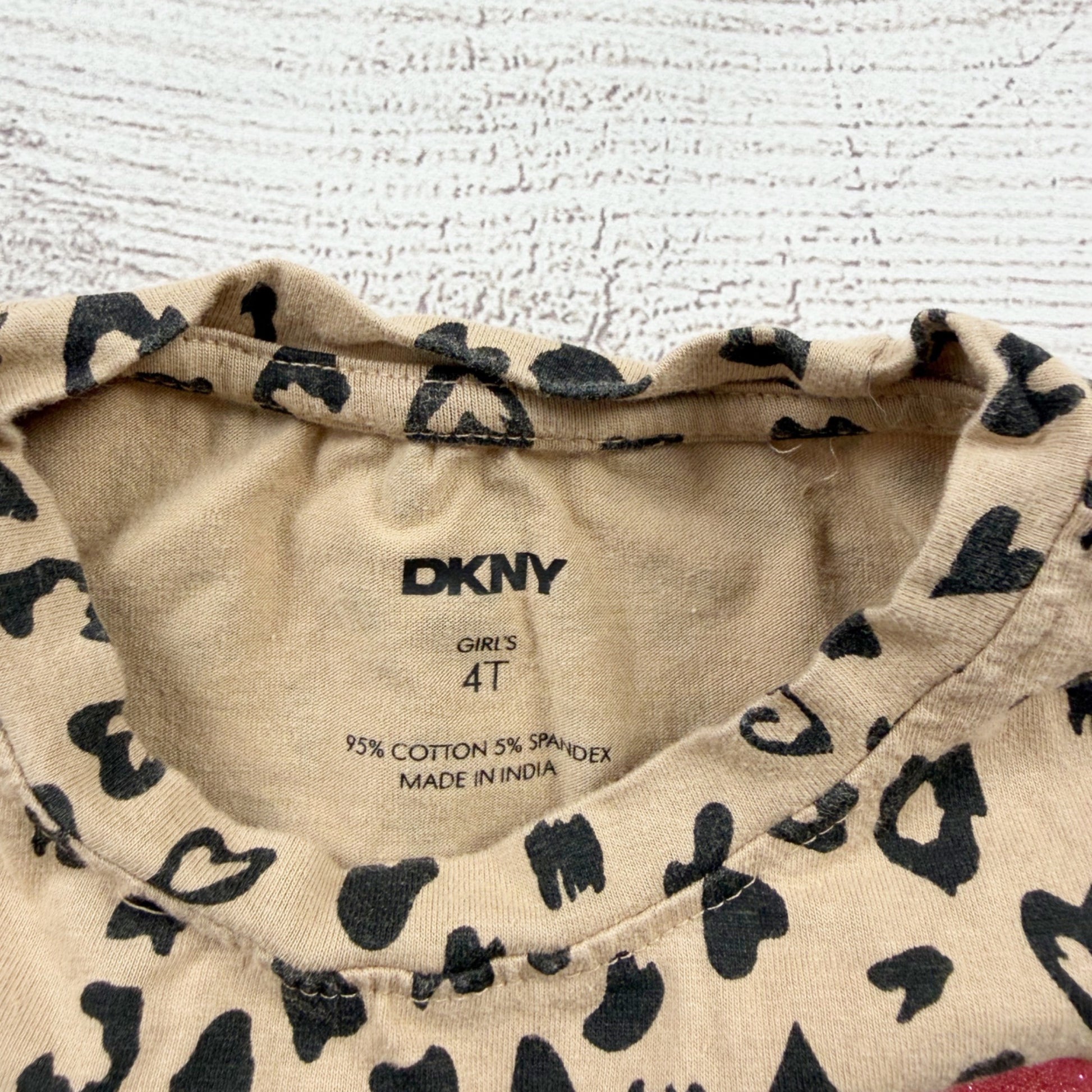 DKNY girls dress, 4T dress, leopard print dress toddler, heart print dress, tan black dress, pink DKNY logo, casual toddler dress, stretchy cotton dress