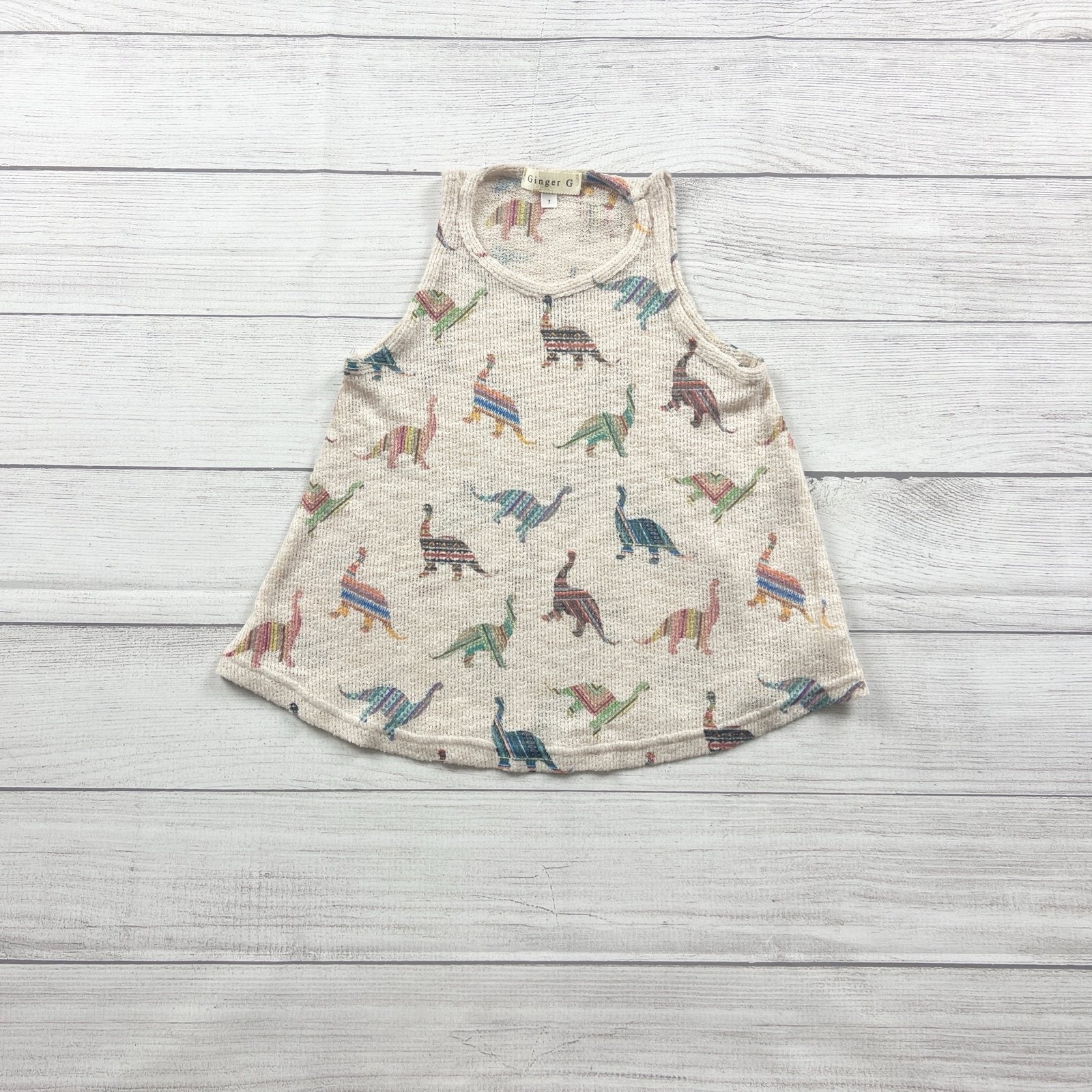 Ginger G girls top, dinosaur tank top girls, size 7 tank top, sleeveless swing top kids, beige dinosaur shirt, kids dinosaur print top, summer top girls, lightweight girls tank, casual outfit top kids, gently used kids clothing, sustainable kids fashion, affordable girls clothes