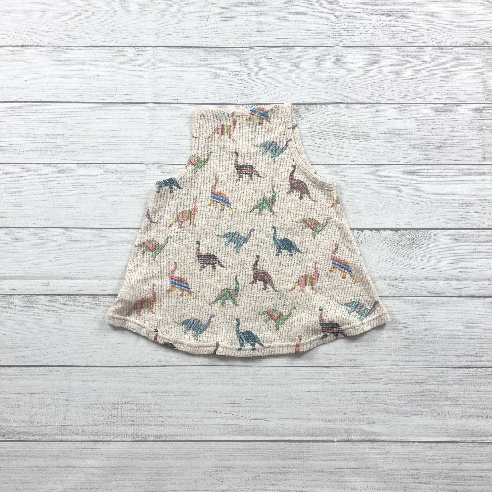 Ginger G girls sleeveless tank top in size 7 featuring a cute multicolor dinosaur print on a soft beige knit fabric. Flowy swing silhouette with a high neckline and wide arm openings for a comfy, breathable fit—perfect for warm weather, layering, and everyday outfits. Lightweight textured knit with a fun playful look. Gently used in great condition.