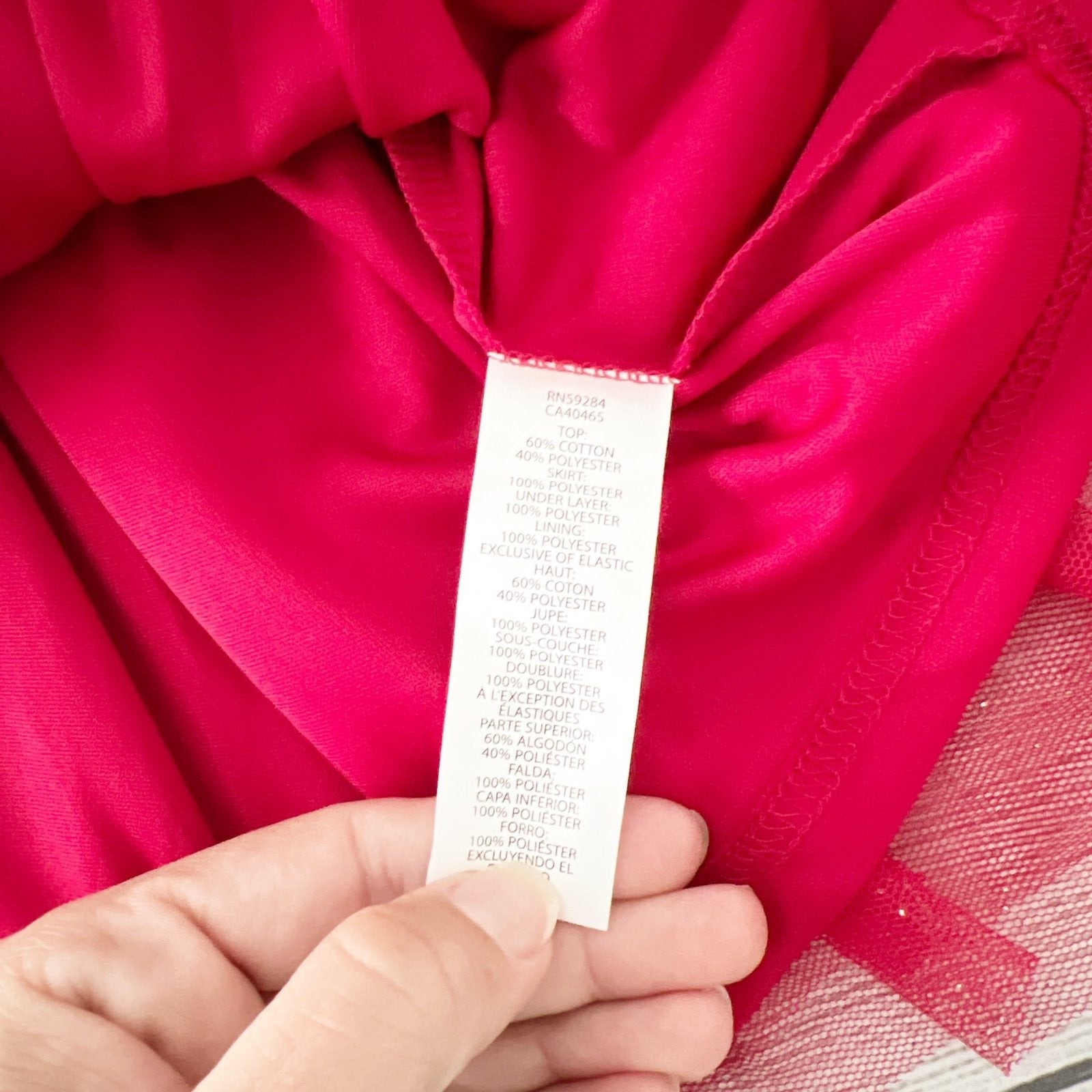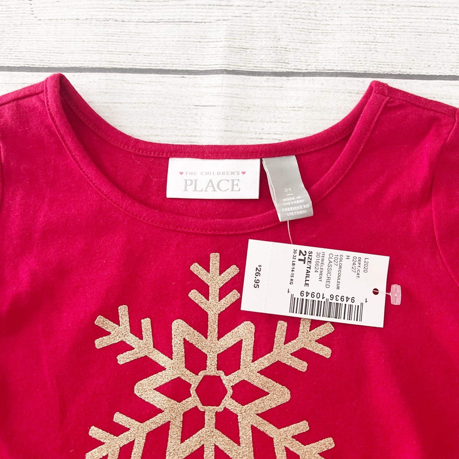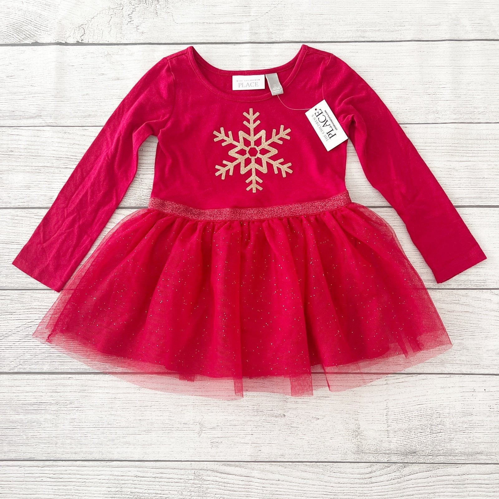 Red long sleeve dress with tulle skirted glitter sparkle bottom. Gold glitter snowflake at center
