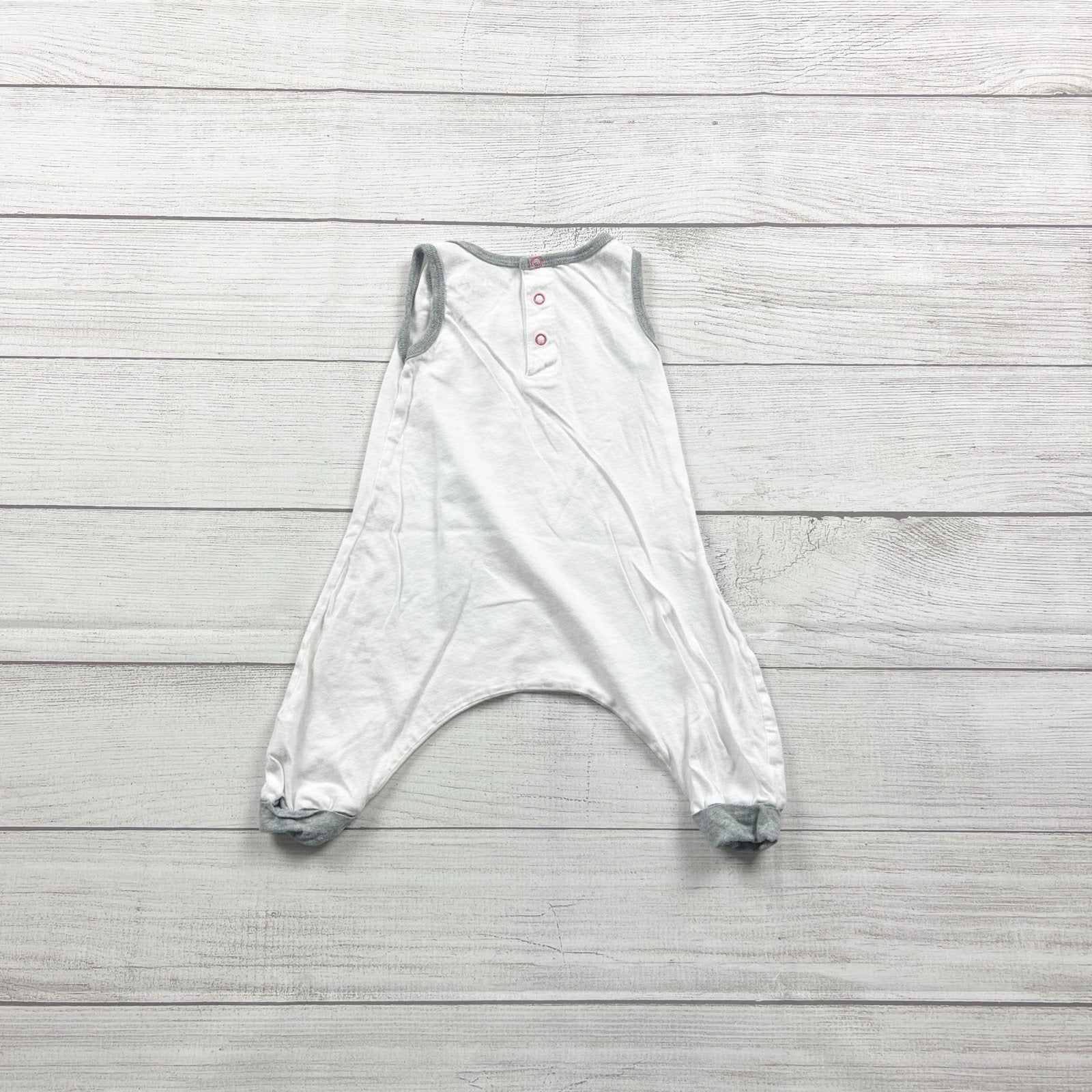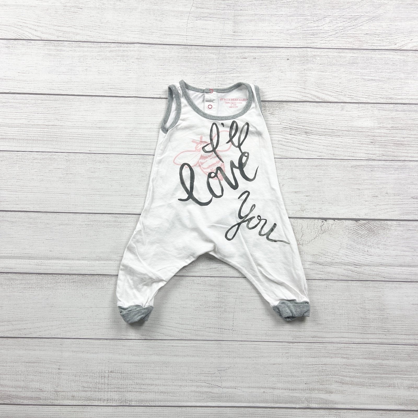 White sleeveless tank top romper with snaps at back. organic cotton. “I’ll love you” on front