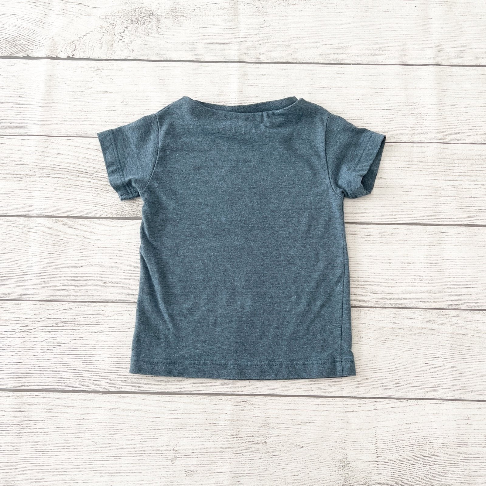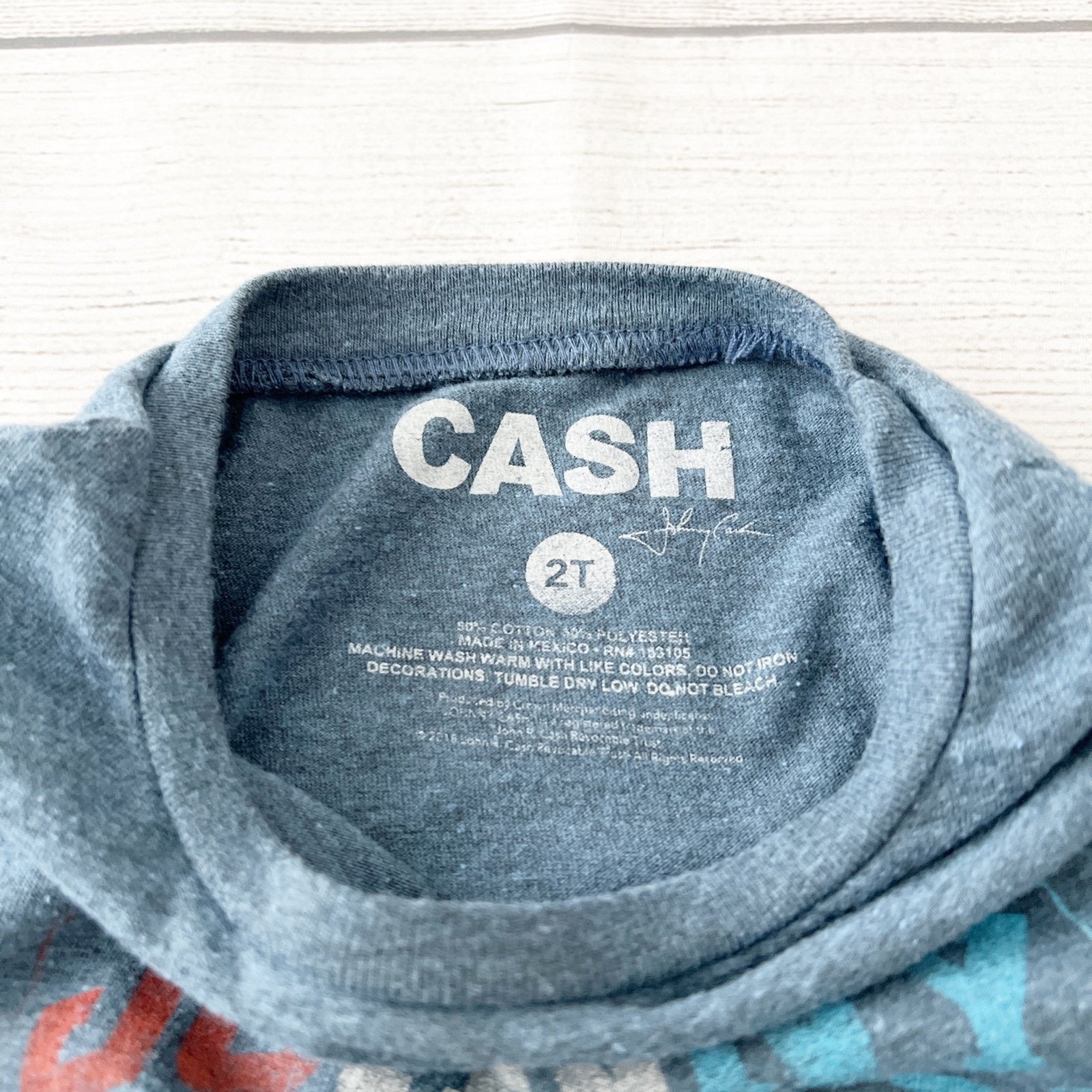 Blue short sleeve shirt with Johnny Cash “The Man in Black” graphic in red white and blue