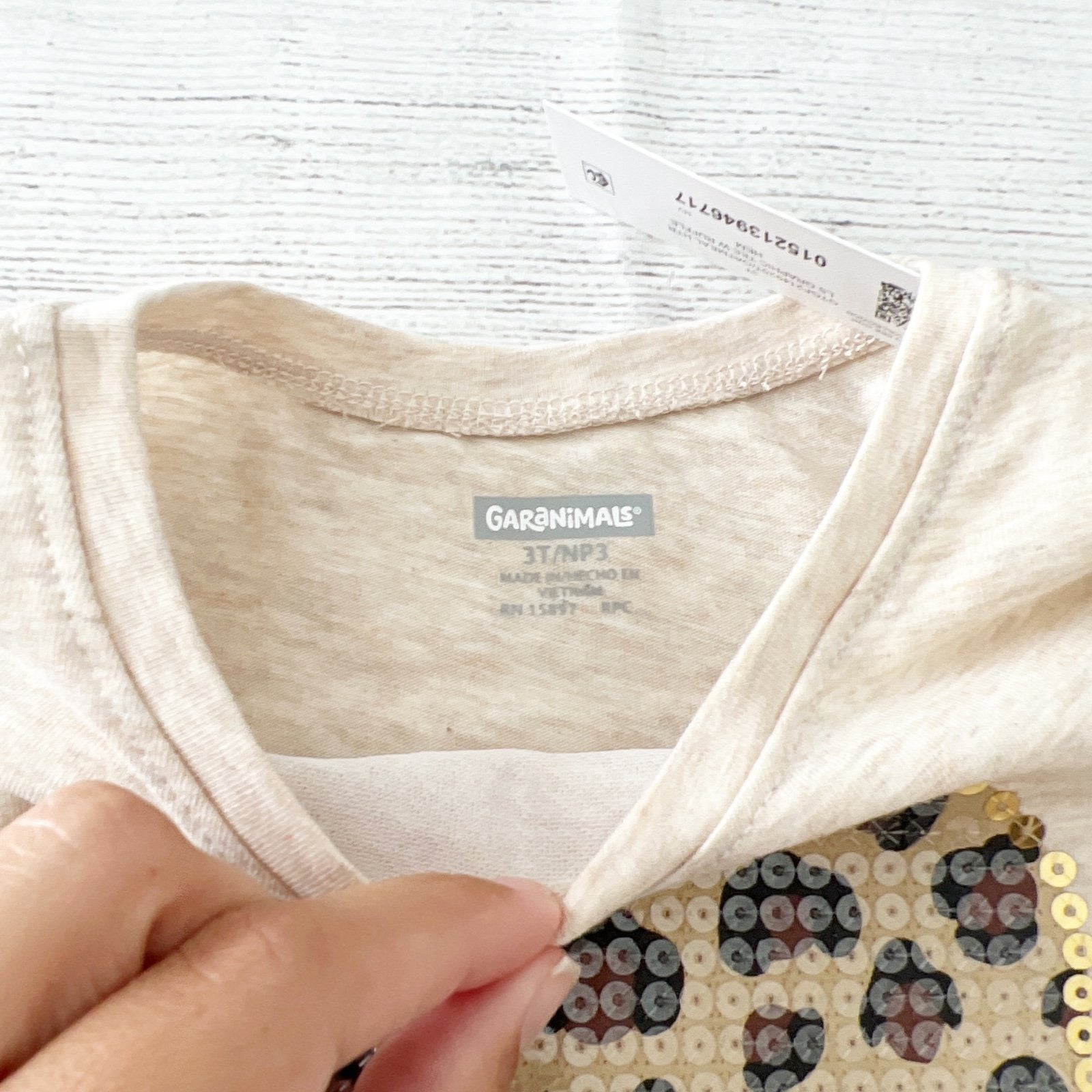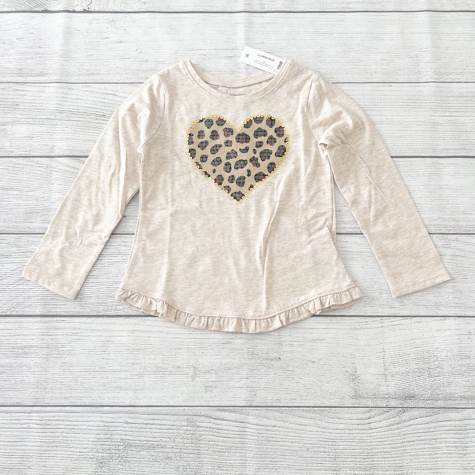 Beige long sleeve peplum style shirt with sequin animal leopard print heart at center
