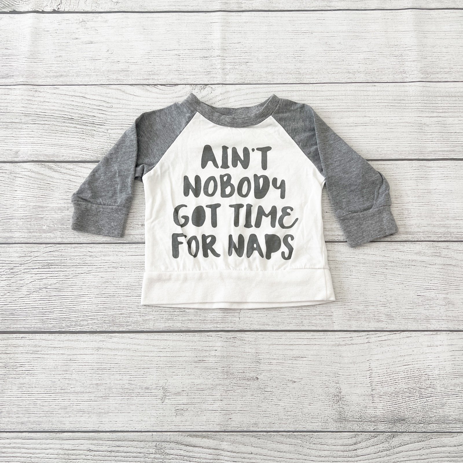 White and grey gray raglan style long sleeve shirt with “ain’t nobody got time for naps”