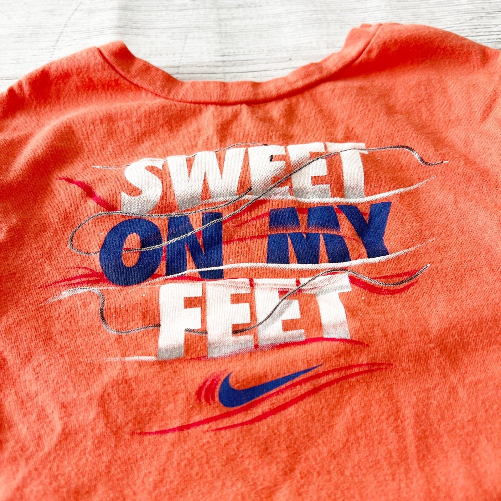 Orange athletic cut shirt with “sweet on my feet” at center.