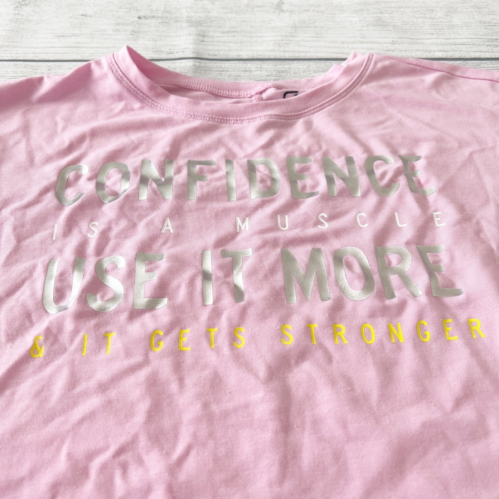 Pink short sleeve shirt with metallic “confidence is a muscle use it more & it gets stronger”