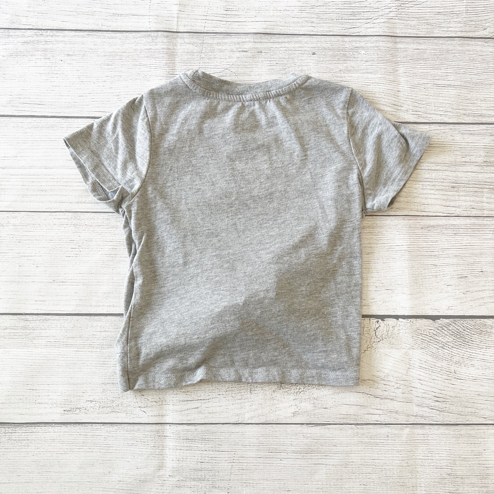 Grey gray short sleeve shirt with twist at bottom. “Pwr ful girl” on front with flip sequin stars and heart.