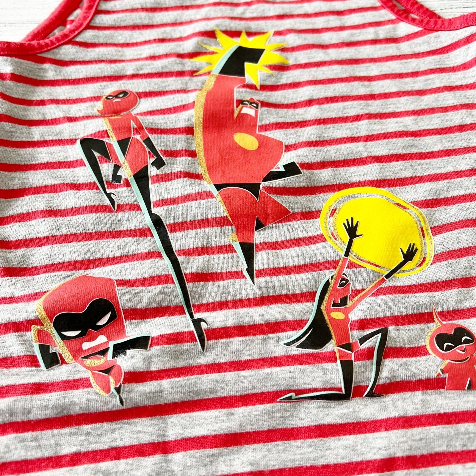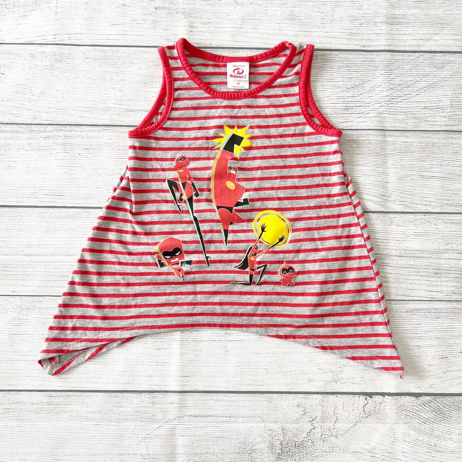 Red and grey gray striped sleeveless tank to with characters from the Incredibles on front.