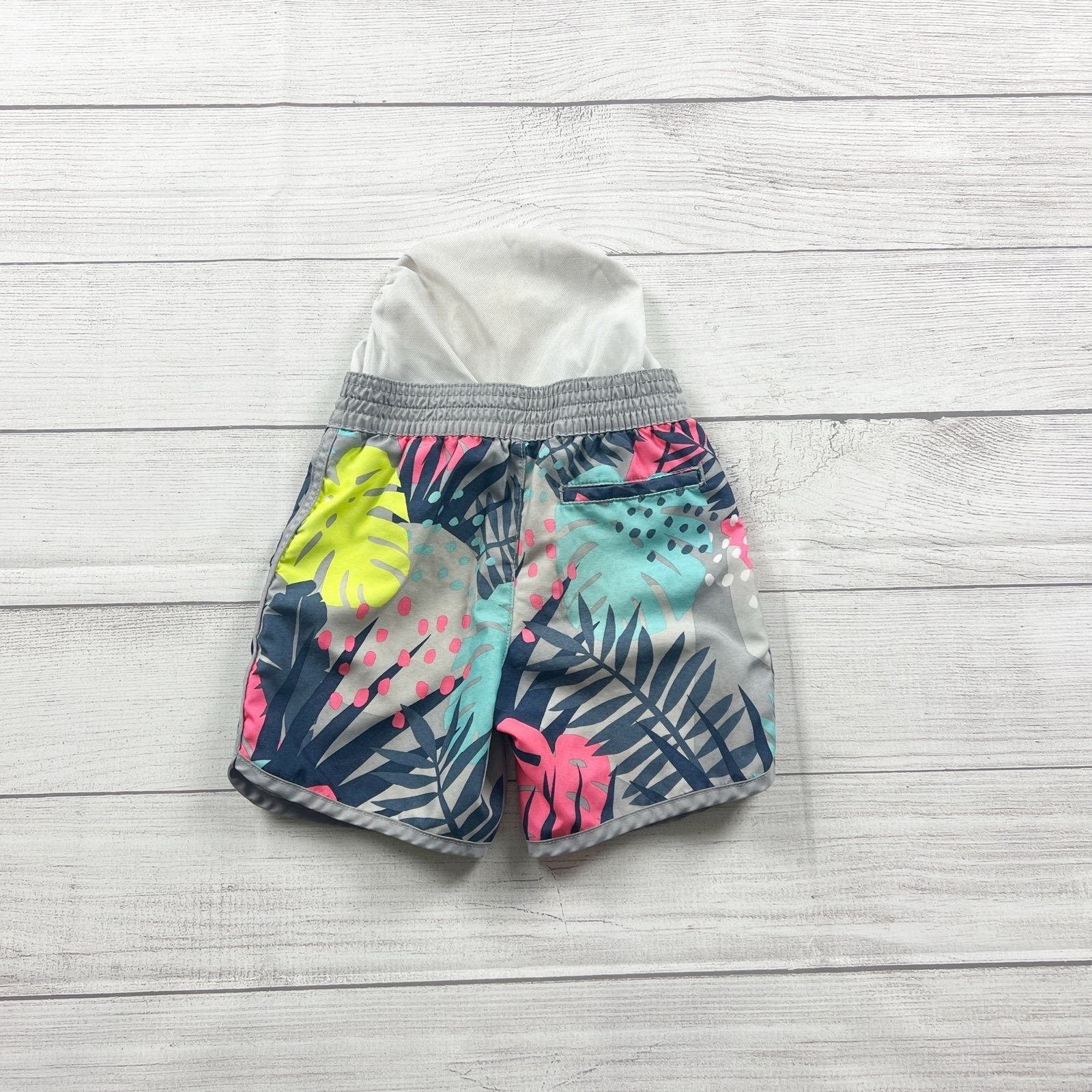 Gymboree toddler swim trunks in size 4T with a fun tropical leaf print in gray, navy, teal, pink, and neon yellow. Elastic waistband with adjustable drawstring for a secure fit. Lightweight swim fabric with mesh lining for comfort at the pool or beach. Gently used condition.