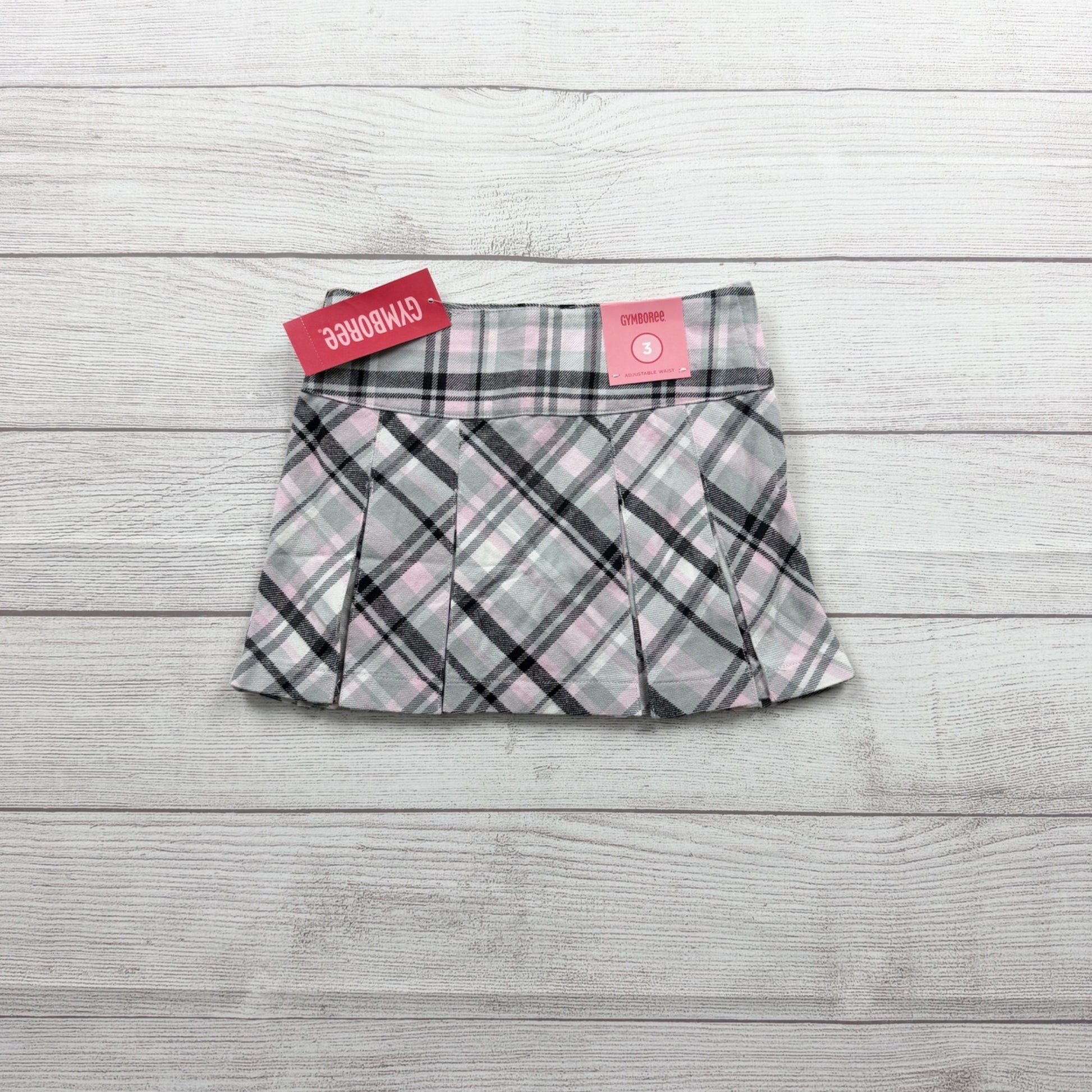 Gymboree girls pleated skirt in size 3 featuring a cute pink, gray, and black plaid pattern. Soft cotton with a comfortable elastic waistband and classic pleated design—perfect for school, dress-up days, and everyday wear. New with tags.
