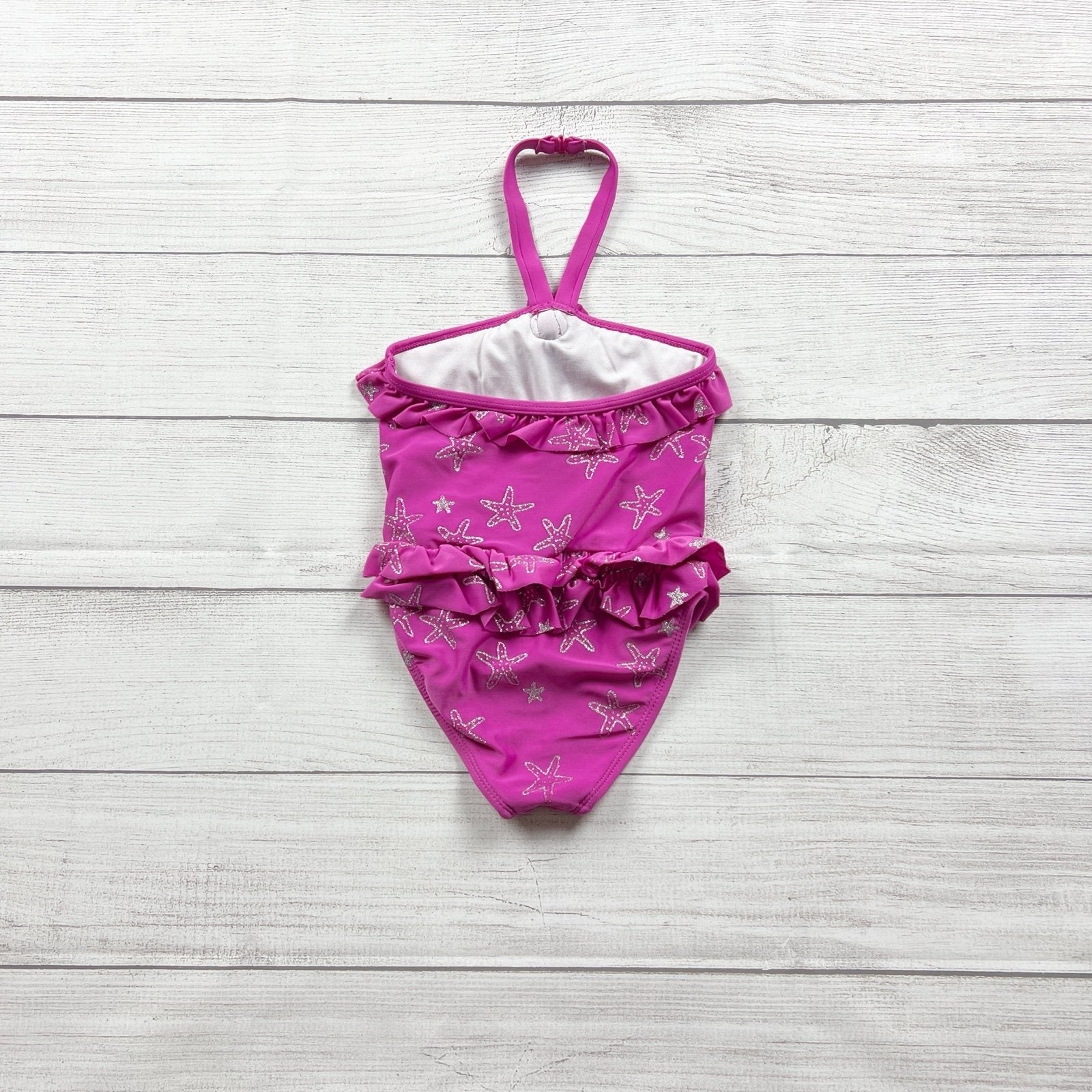 Gymboree toddler girl one-piece swimsuit in size 2T in bright pink with an allover starfish print. Halter-style strap with a cute flower accent at the neckline and ruffle details for an extra-sweet look. Fully lined and perfect for pool days, beach trips, and summer vacations.