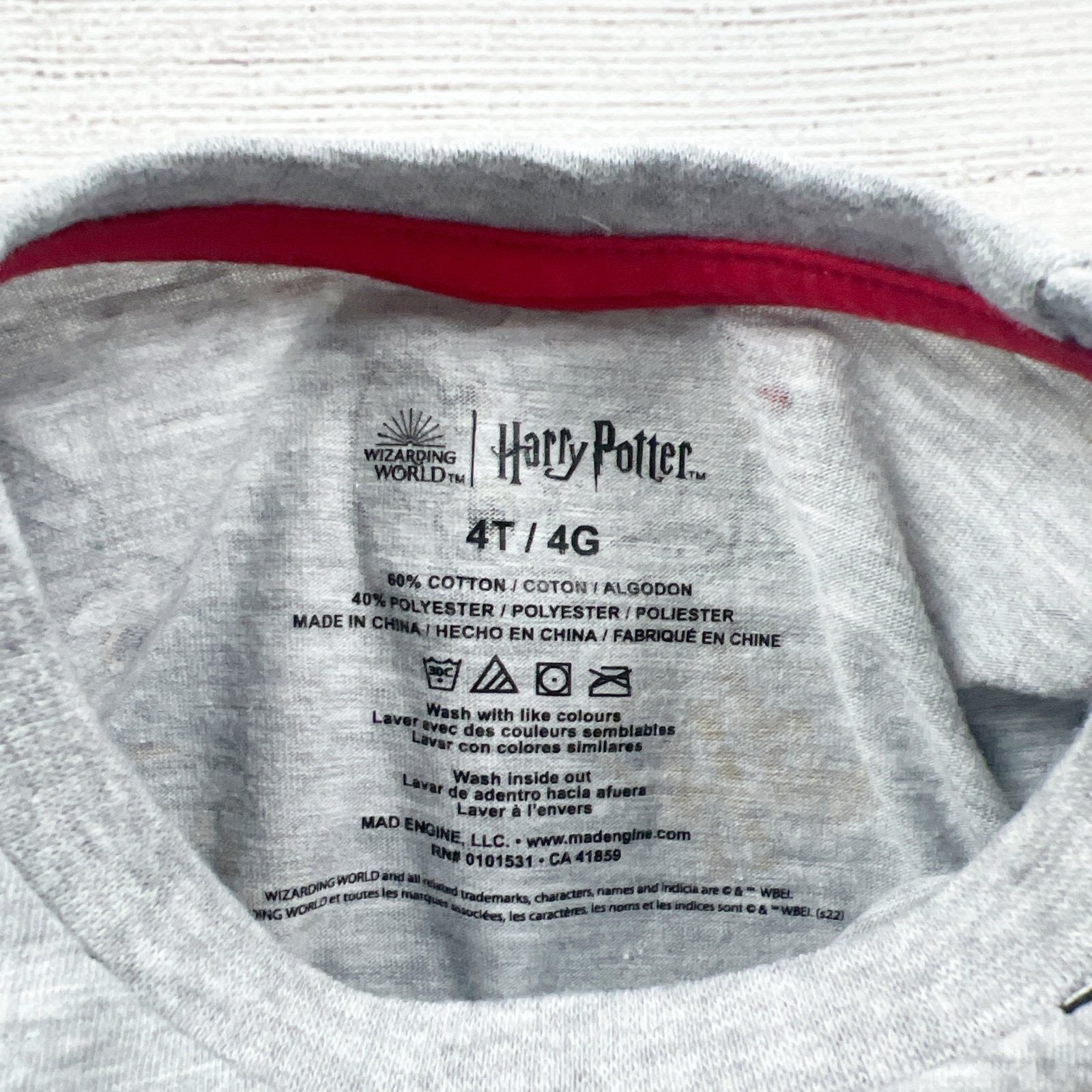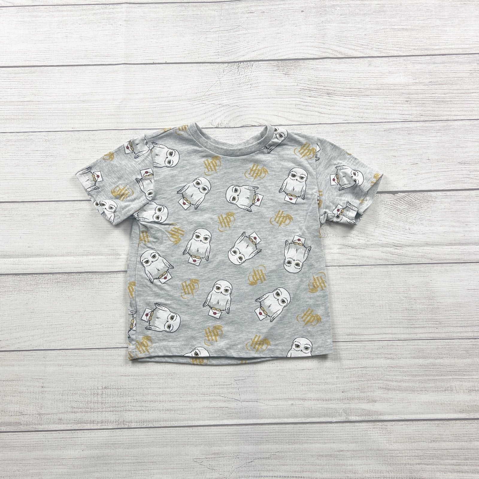 Harry Potter toddler short sleeve t-shirt in size 4T. Gray tee with an allover Hedwig owl print (with Hogwarts letters) and gold Harry Potter logo accents. Soft cotton blend, perfect for everyday wear and Harry Potter fans.
