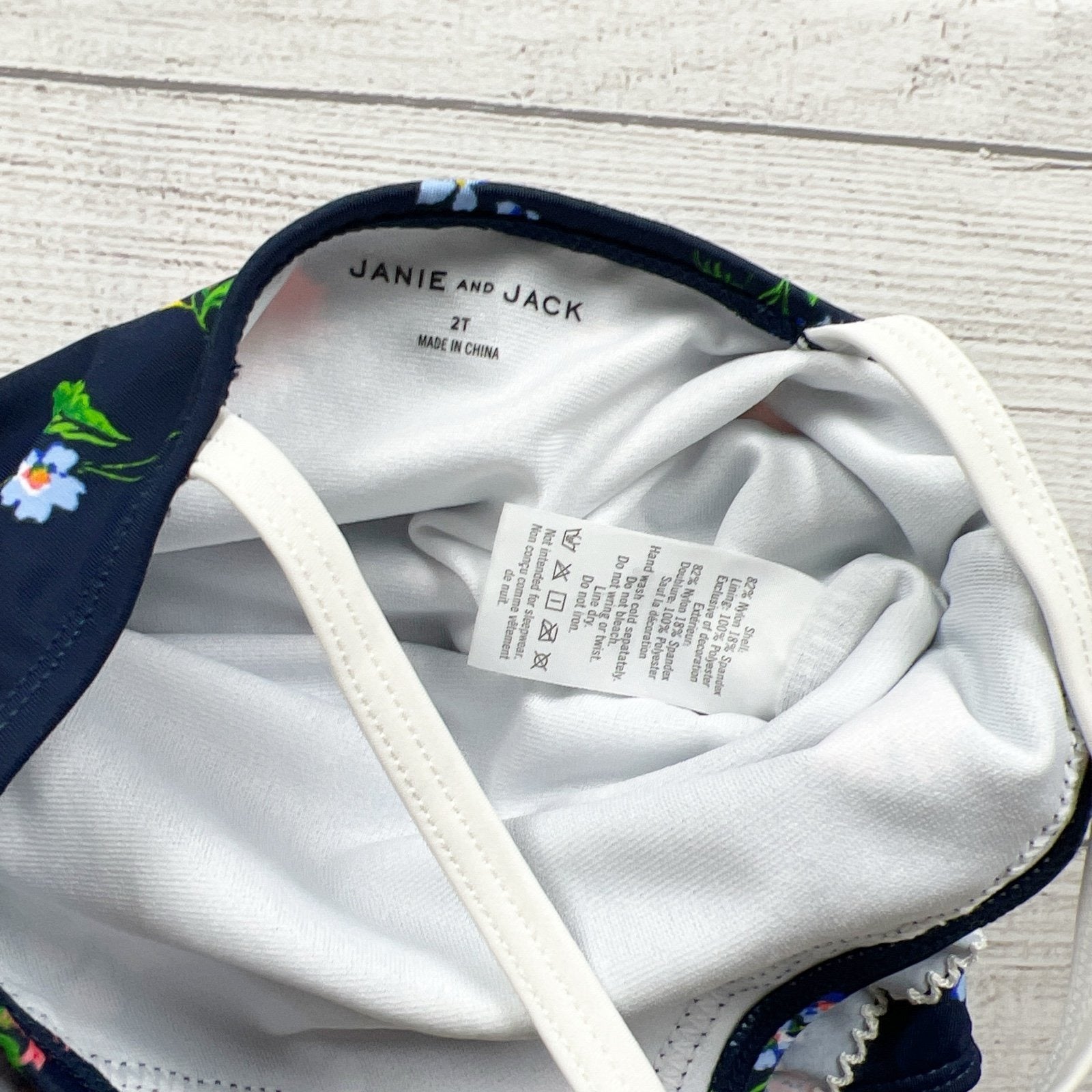 Janie and Jack toddler girl one-piece swimsuit in size 2T featuring a navy background with a colorful floral print and sweet ruffle details. Halter-style straps and fully lined design for a comfortable, secure fit. Perfect for pool days, beach trips, and summer vacations.