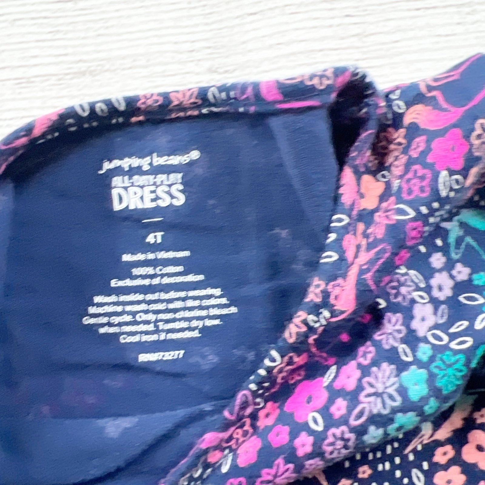 Jumping Beans girls short-sleeve dress in size 4T with an allover floral print. Navy base with pink, teal, purple, and white flowers. Easy pullover style with a gathered waist and twirl-friendly skirt—great for everyday play, school, or casual outings. 100% cotton.