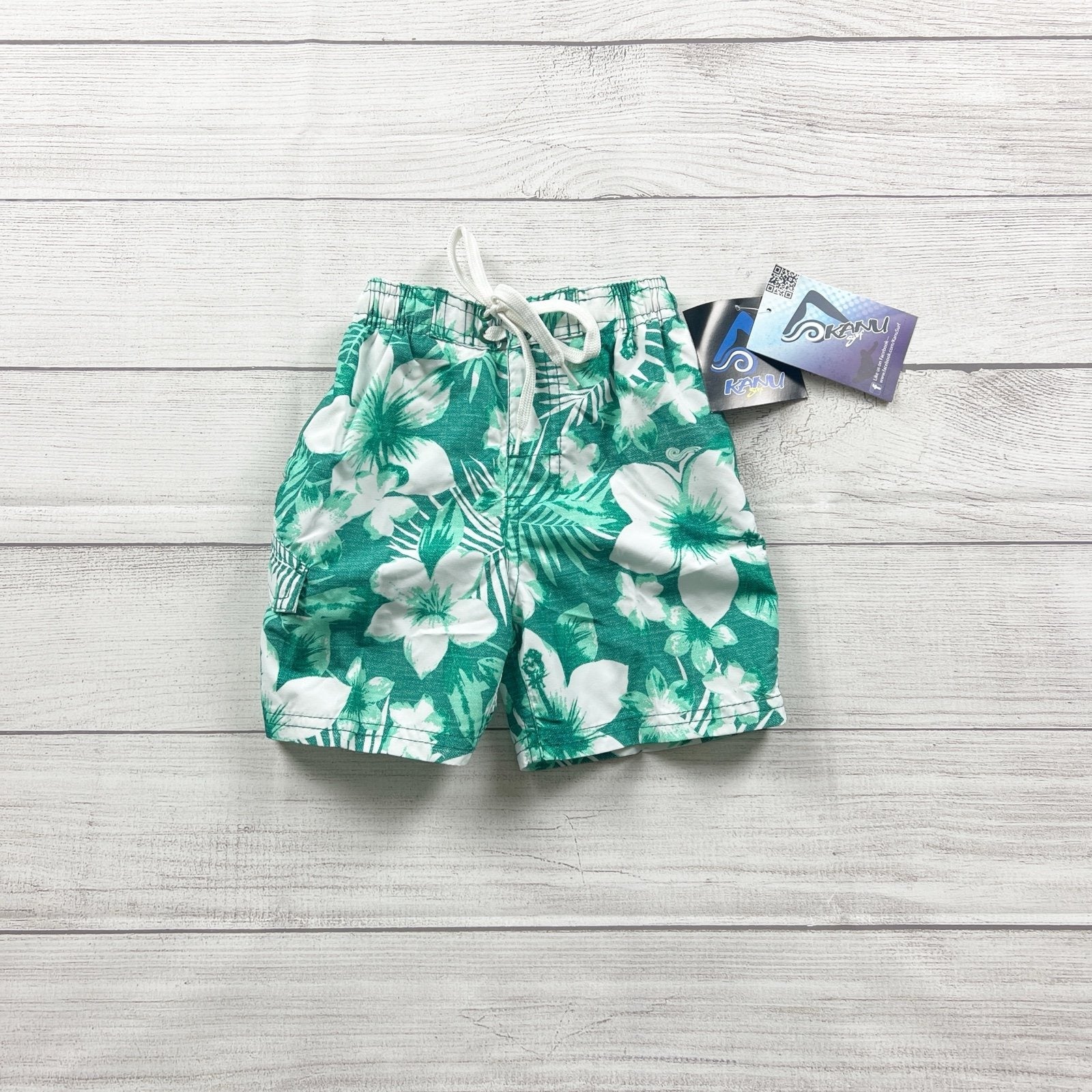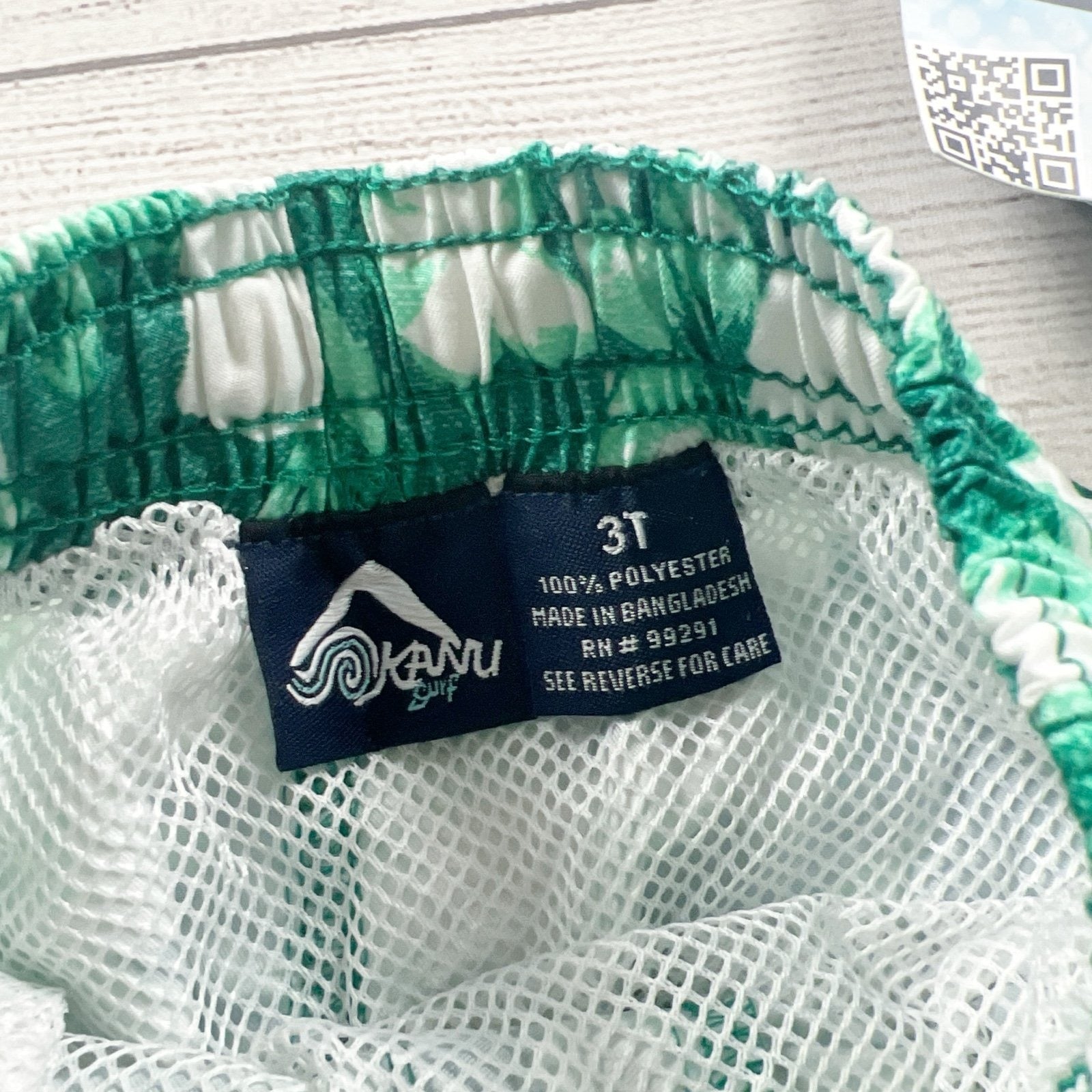 Kanu Surf toddler swim trunks in size 3T. Green and white tropical floral print with an elastic waistband and adjustable drawstring for a secure fit. Mesh lined for comfort at the pool or beach. New with tags—perfect for summer and vacation.