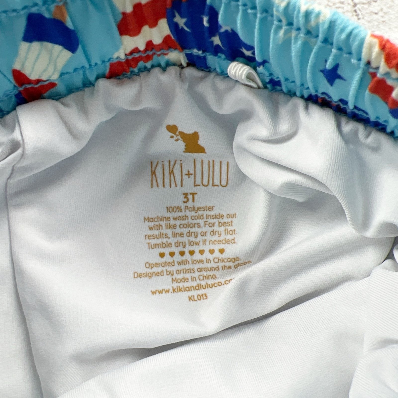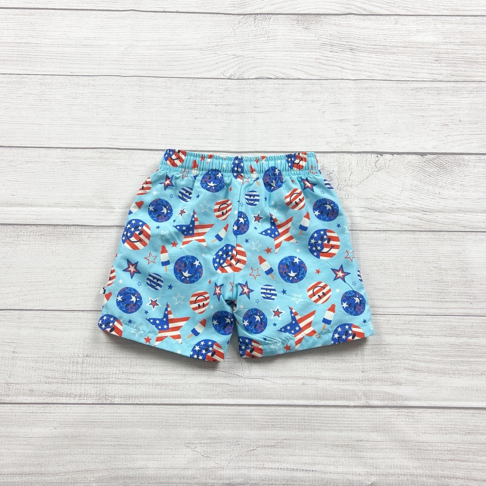 Kiki + Lulu boys swim trunks in size 3T. Blue with a patriotic stars and stripes print, elastic waistband, and drawstring. Quick-dry fabric, perfect for pool, beach, 4th of July, and summer fun.