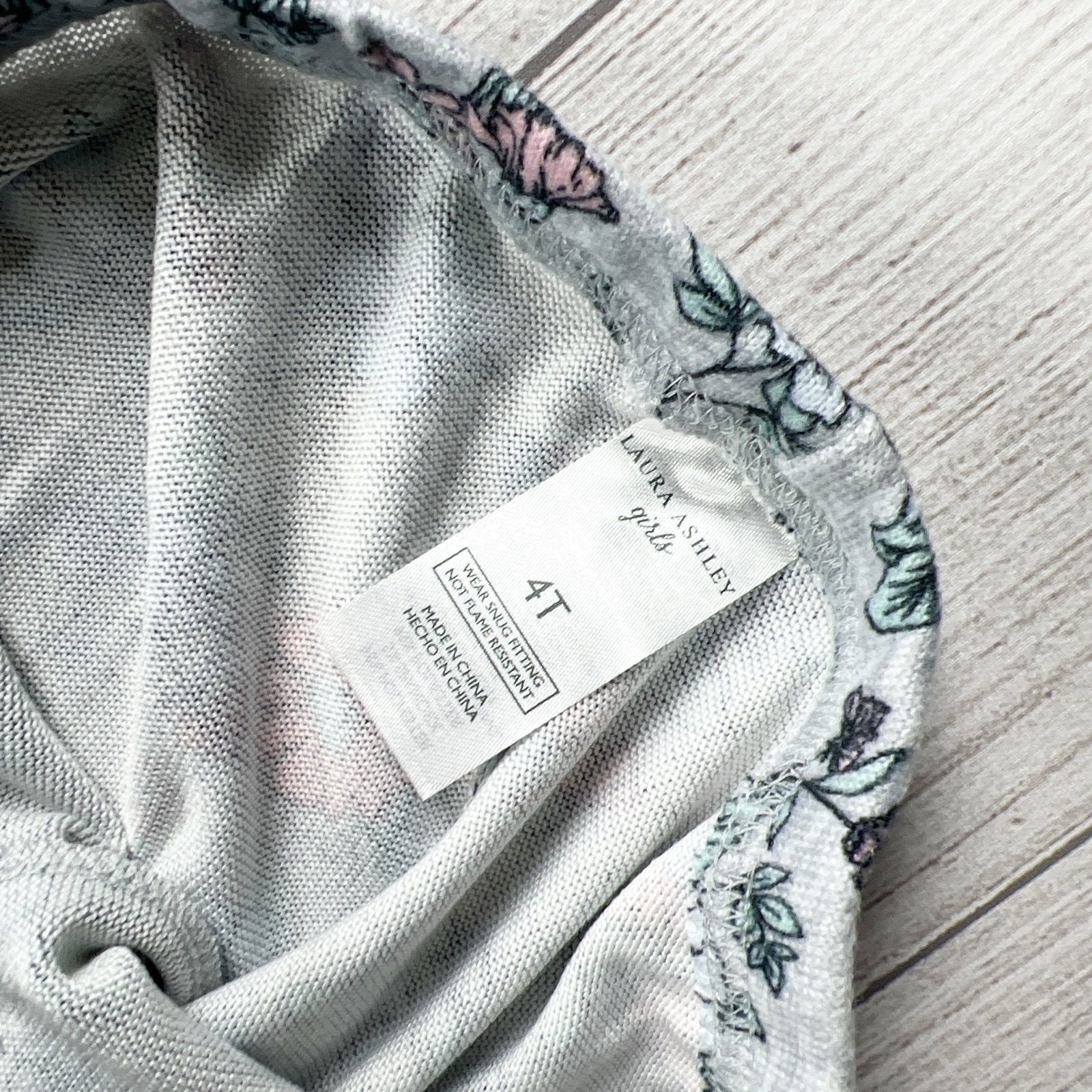 Laura Ashley girls 2-piece pajama set in size 4T featuring a soft gray background with a delicate floral print. Cozy long sleeve sleep shirt with matching pajama pants and cuffed ankles for a comfy fit. Great for bedtime, sleepovers, and lounging.