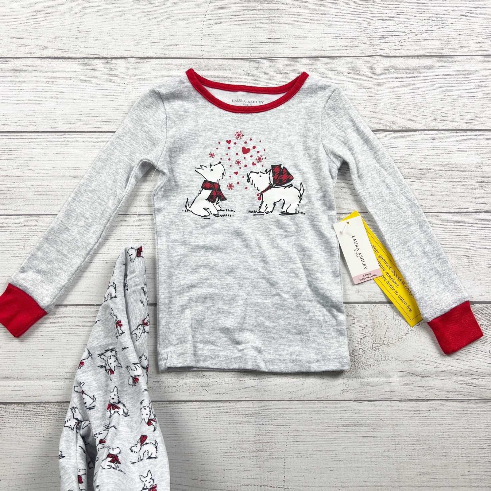 Laura Ashley girls 2-piece pajama set in size 4T in heather gray with red trim. Includes a long-sleeve top with a cute dog graphic and matching pants with an allover dog print. Snug-fitting for safety (per tag). Soft, stretchy fabric blend (95% polyester / 5% spandex per tag). New with tags.