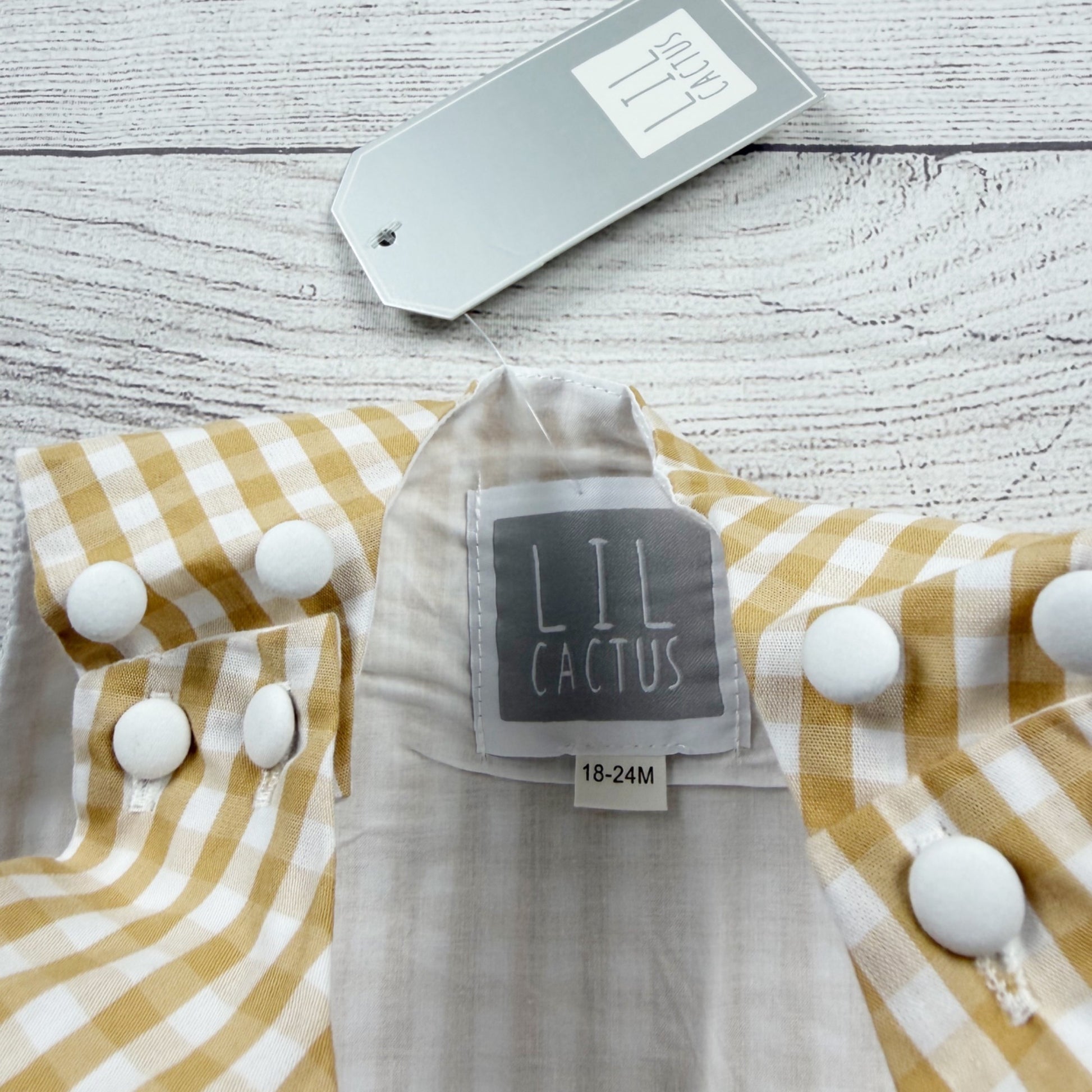 Lil Cactus baby/toddler longall in size 18-24 months. Yellow and white gingham one-piece with a smocked panel featuring embroidered pumpkins across the chest. Adjustable button straps and snap closures for easy changes. Perfect for fall, pumpkin patch photos, Thanksgiving, and family pictures.