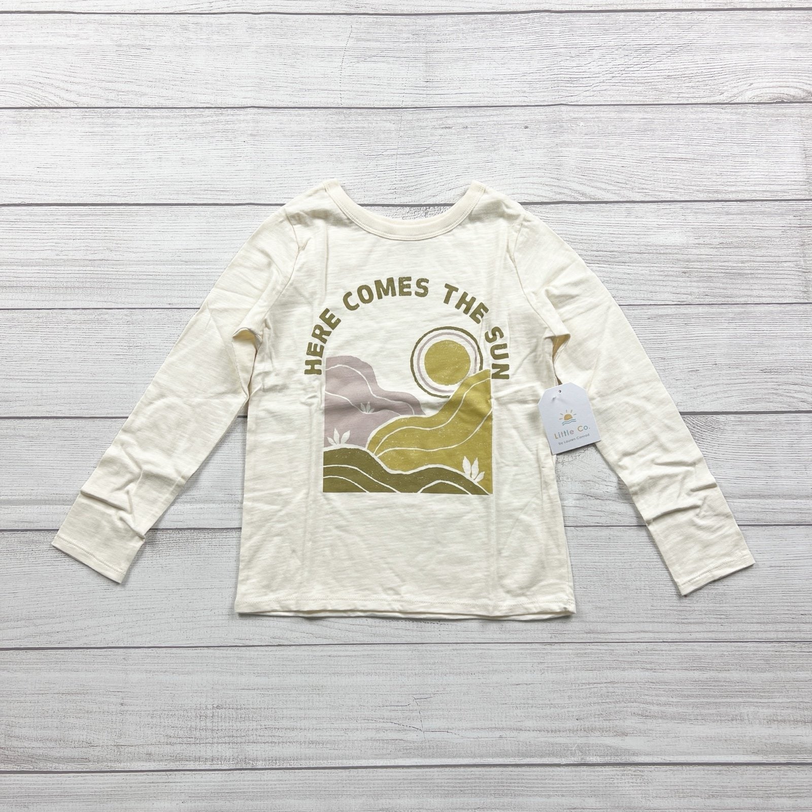 Little Co. by Lauren Conrad kids long sleeve t-shirt in size 5 in soft cream featuring a beautiful "Here Comes the Sun" landscape graphic. Made from 100% organic cotton with OEKO-TEX certification for safety and sustainability. Perfect for everyday wear, layering, and casual outfits. New with tag.