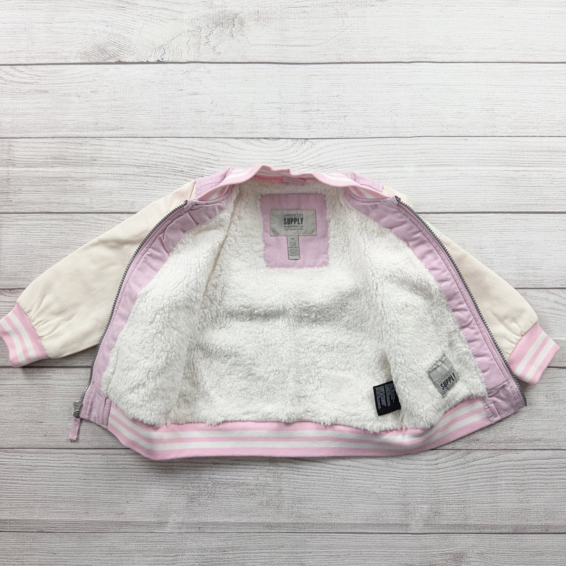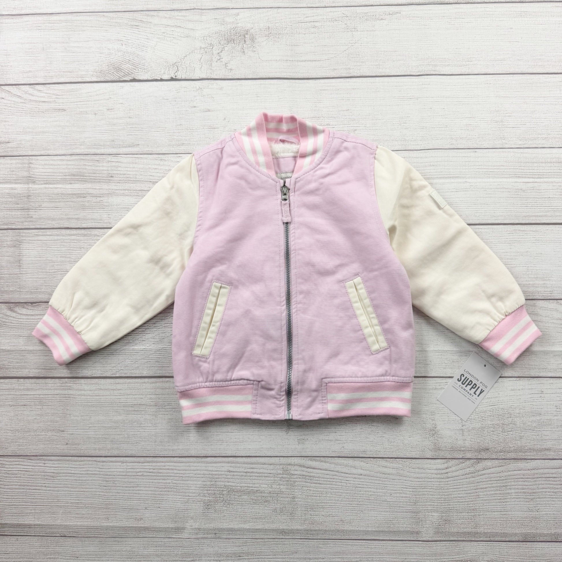 London Fog toddler girls varsity-style jacket in size 3T. Soft light pink body with cream sleeves and striped ribbed collar, cuffs, and hem. Full zip front with front pockets and cozy sherpa lining for warmth—perfect for fall and winter layering.
