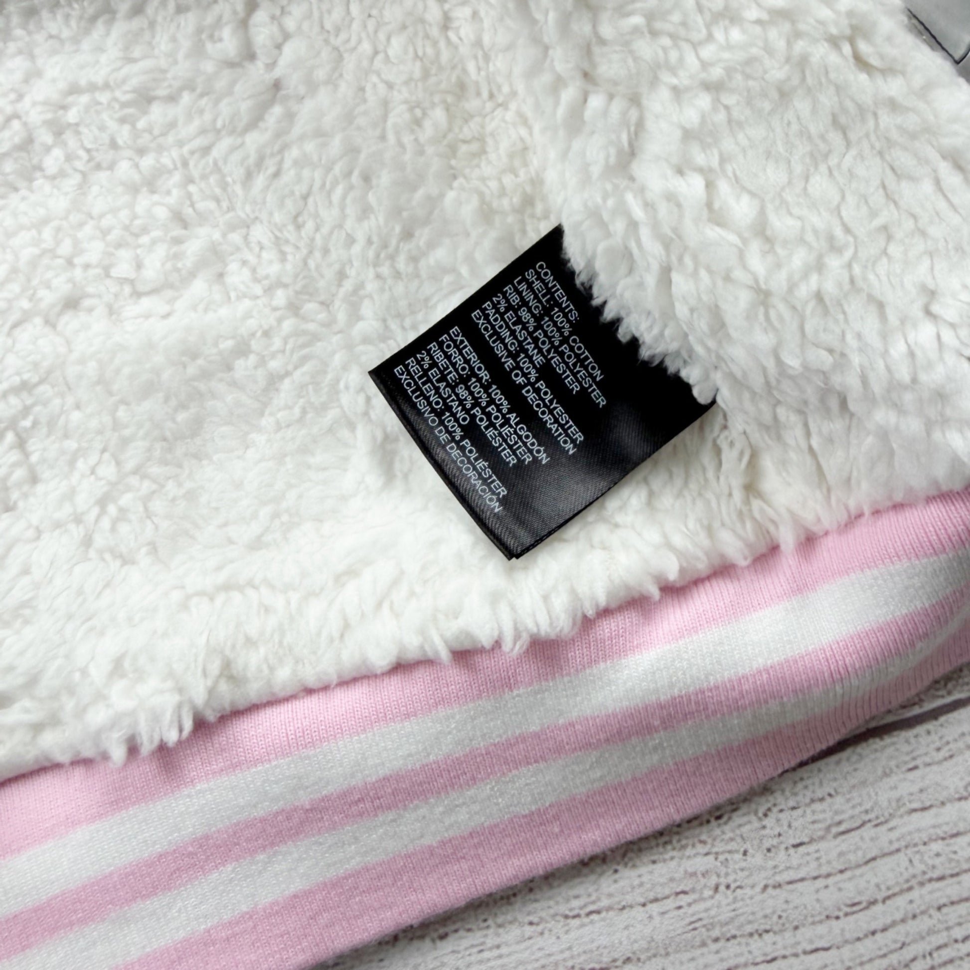 Material: Shell: 100% cotton; Sherpa: 100% polyester; Lining: 100% polyester; Rib: 98% polyester / 2% elastane (per tag)