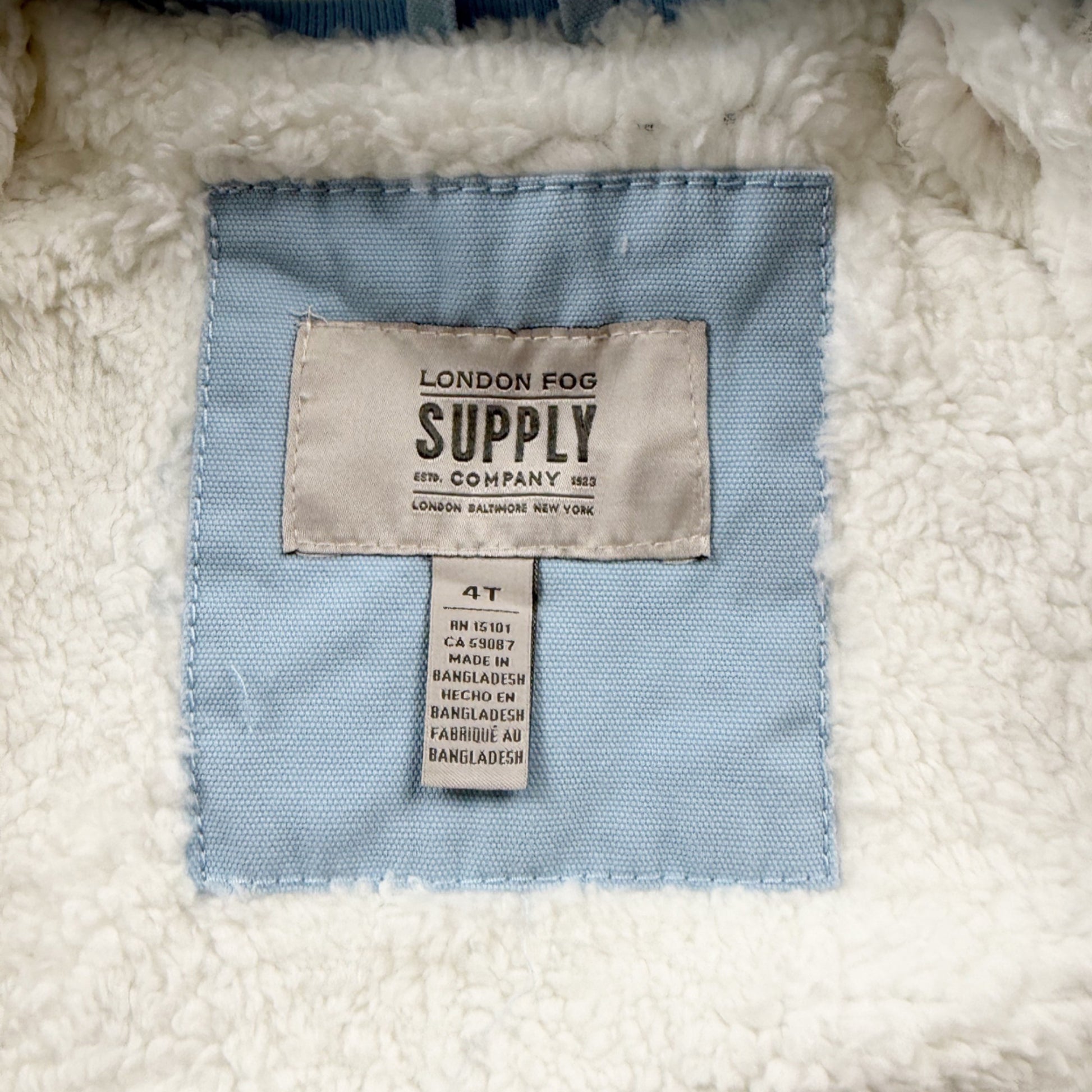 London Fog Supply toddler varsity-style jacket in size 2T. Light blue body with cream sleeves and striped ribbed collar, cuffs, and hem. Full zip front with front pockets. Cozy sherpa lining for extra warmth—great for fall and winter layering.