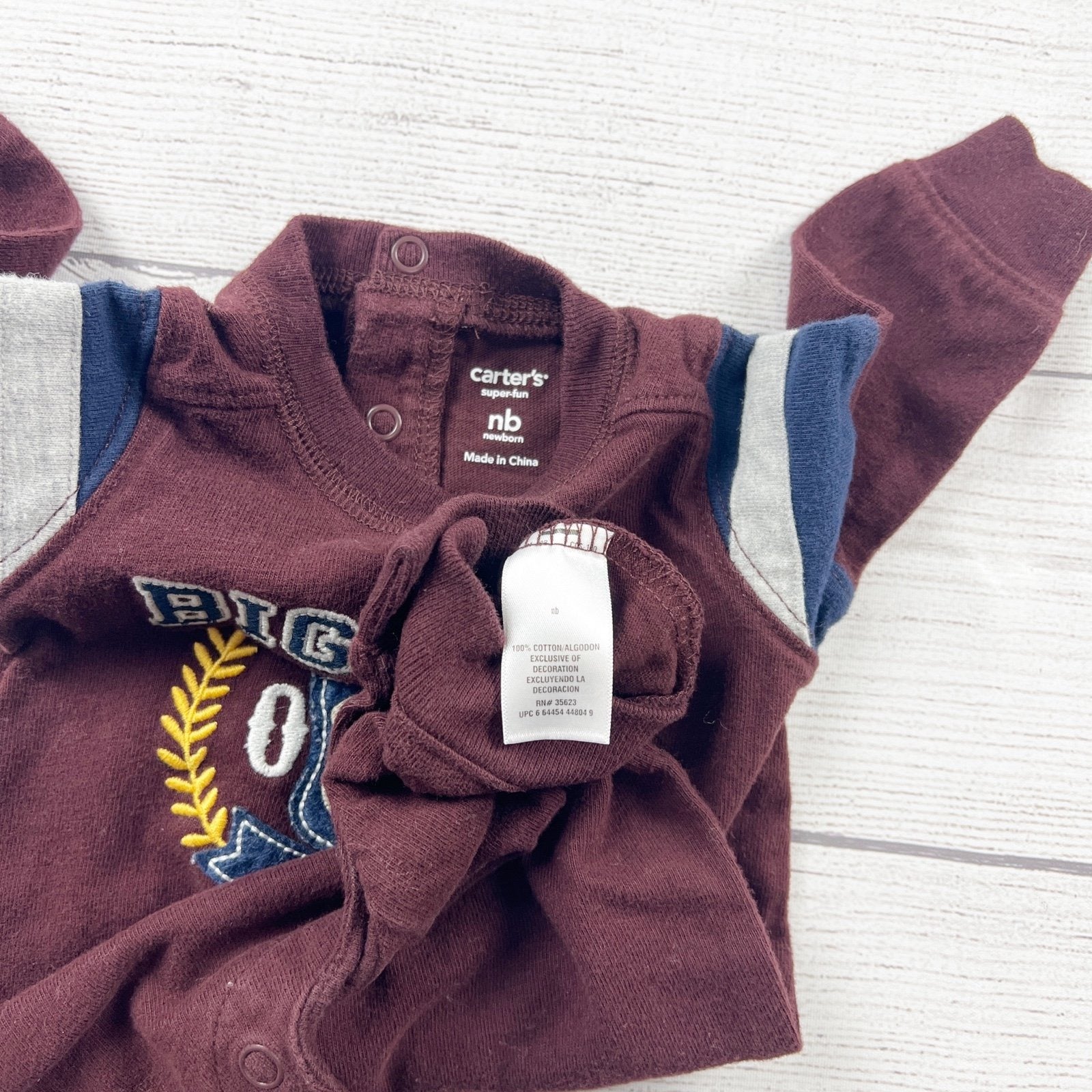 Maroon long sleeve and pants one piece romper with snaps at legs. Embroidered “Big man on campus” with bear