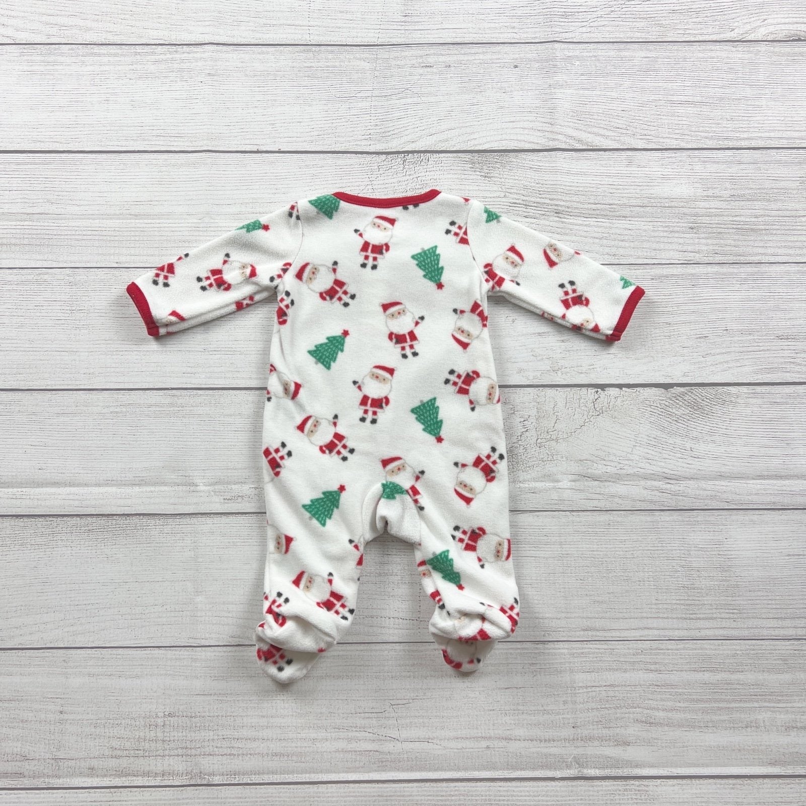 White fleece long sleeve dual zip up footed sleep and play pajamas. Santa face on feet. Print includes Christmas trees and Santa's. “My very first Christmas” on chest