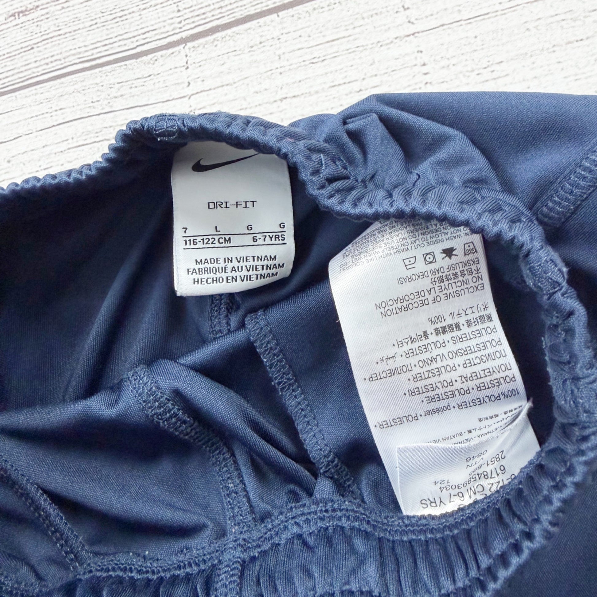 Nike Dri-FIT shorts, boys Nike shorts 7, navy boys athletic shorts, kids sports shorts, moisture wicking kids shorts, elastic waist boys shorts, Nike swoosh shorts, gym class shorts kids, soccer shorts boys, basketball shorts kids, activewear shorts boys, gently used kids clothing, sustainable kids fashion, affordable Nike kids clothes