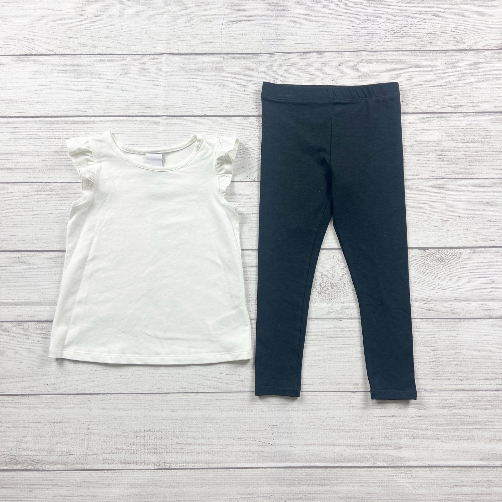 Three piece outfit. Solid brown hoodie hooded long sleeve buttoned pea coat. White short sleeve shirt. Solid black leggings pants