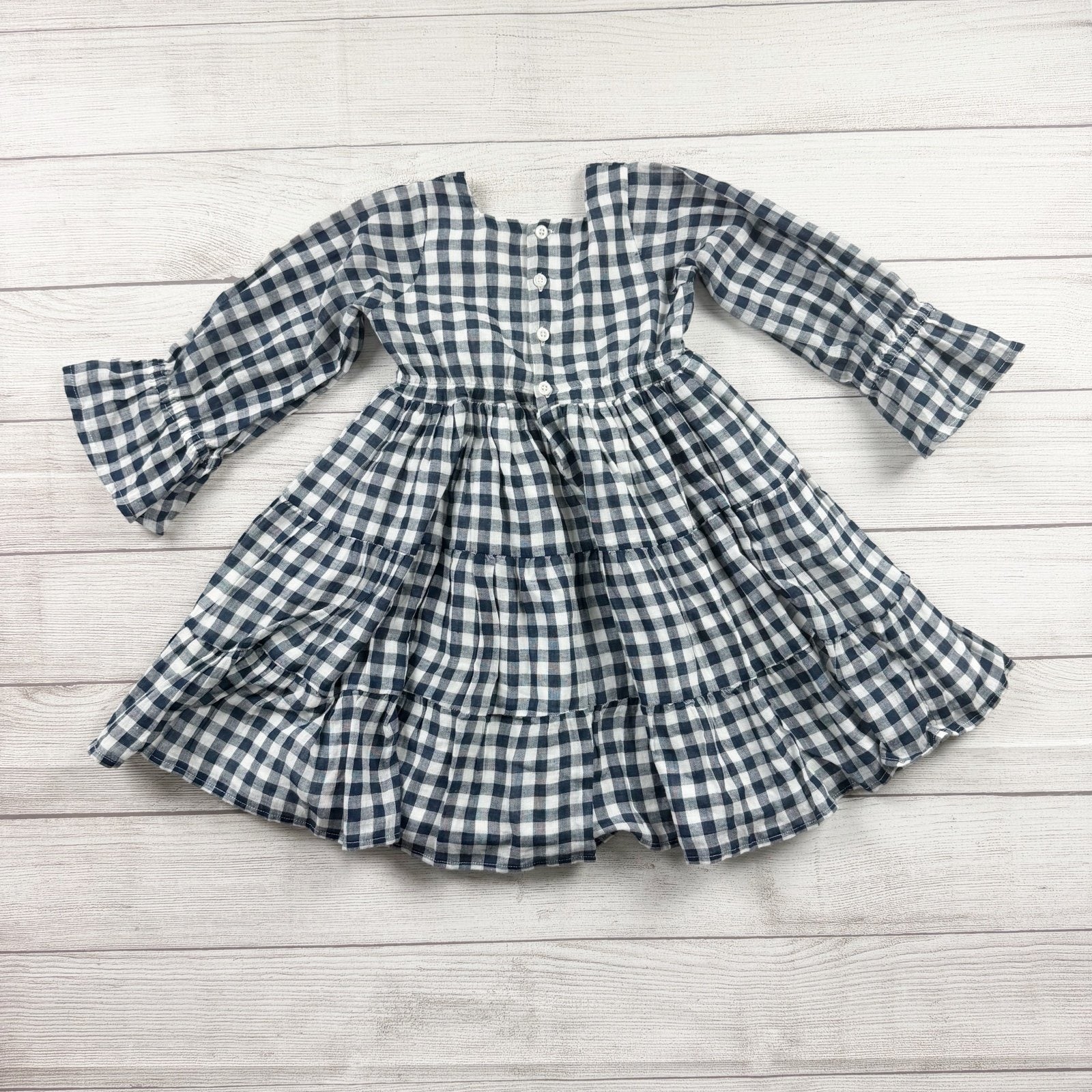 Blue and white gingham plaid long sleeve dress with buttoned back. cotton