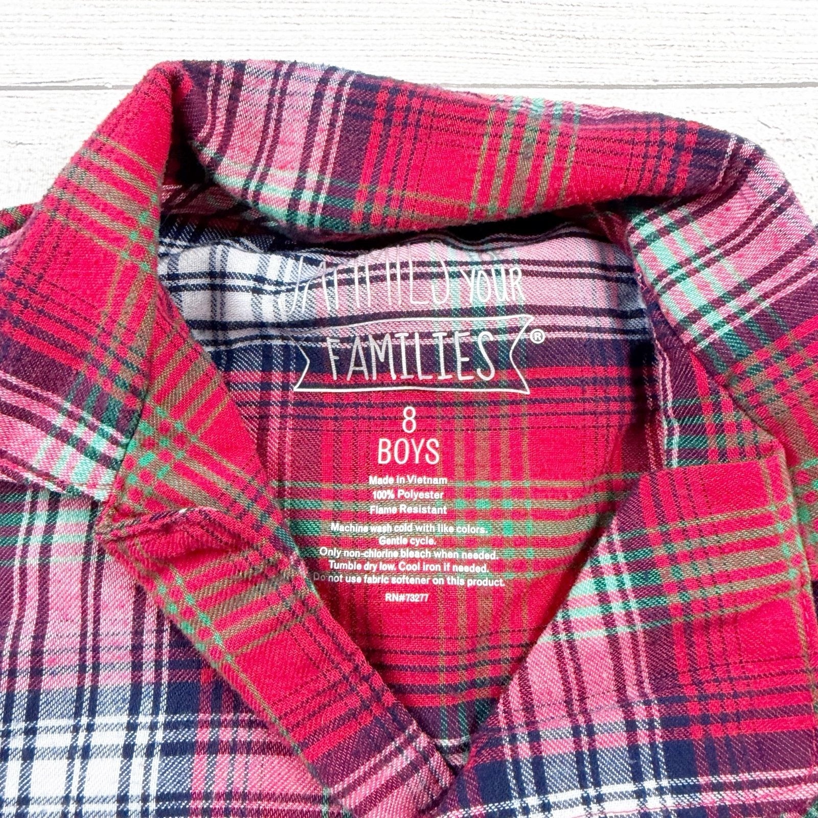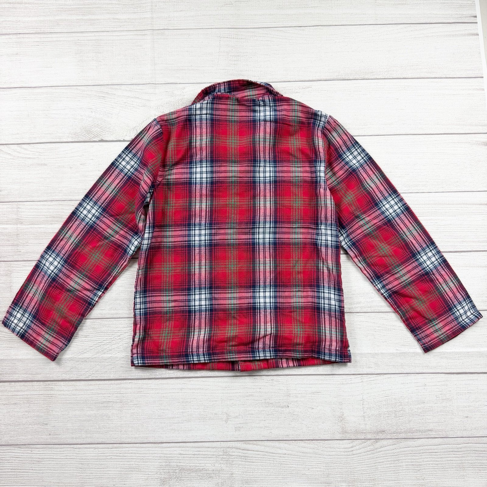 Red plaid polyester long sleeve buttoned collared shirt and pants pajama set.