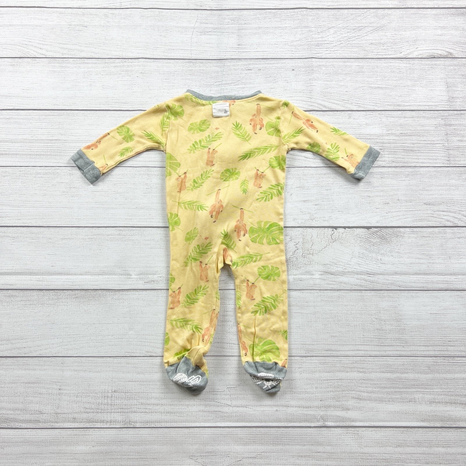 Yellow long sleeve zip up footed sleep and play pajamas with monkey print. Organic cotton