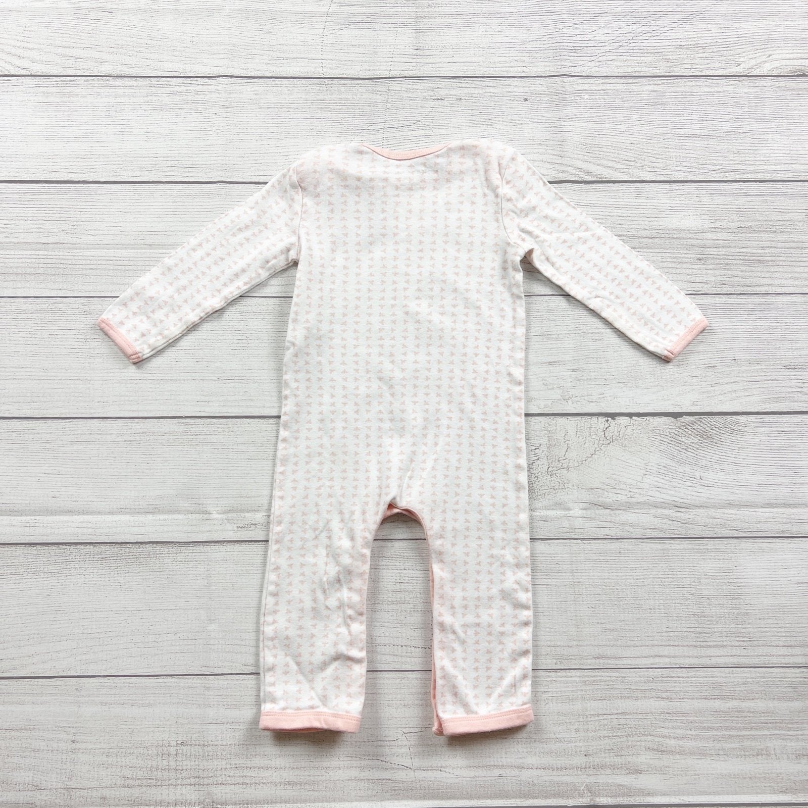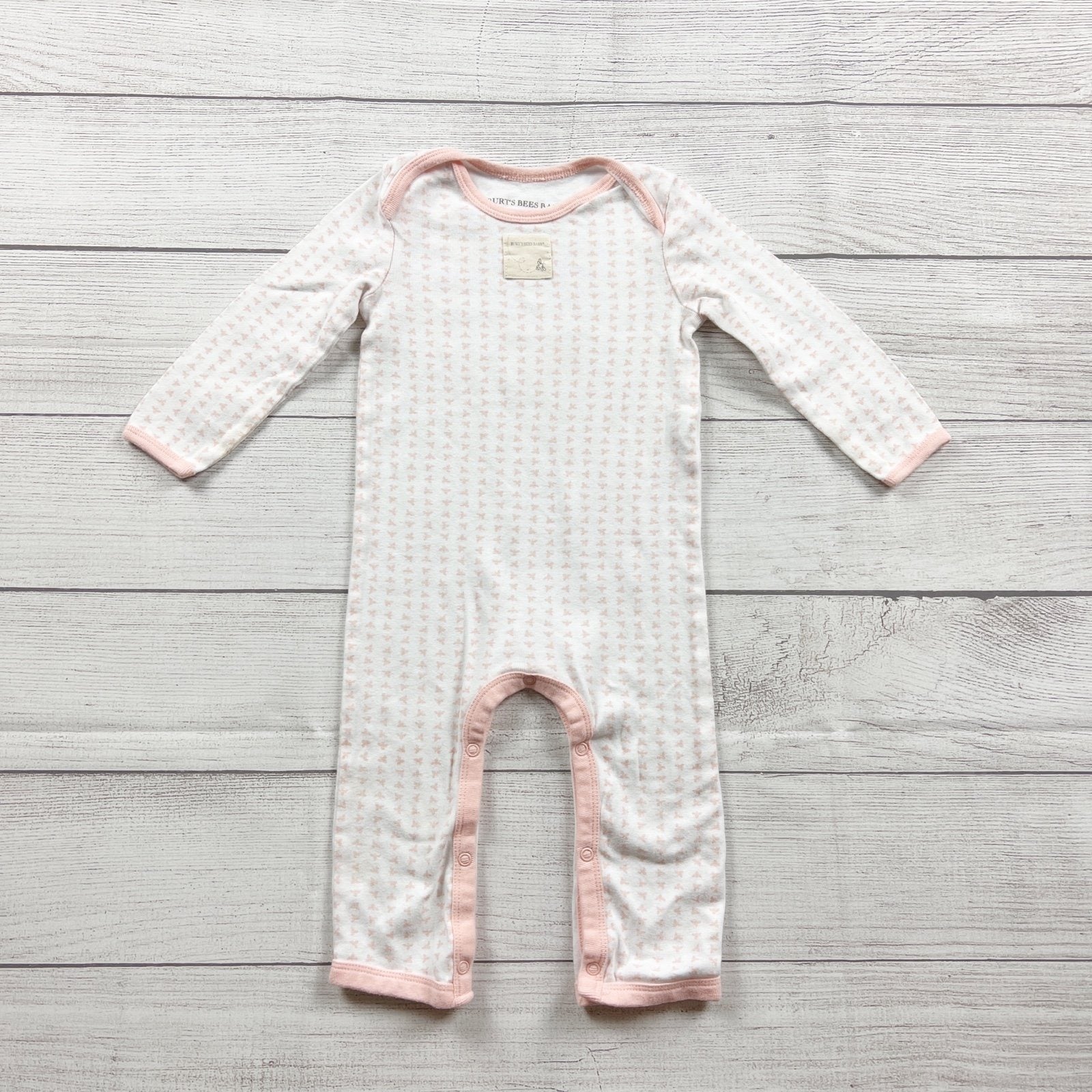 White long sleeve one piece romper with pink trim and bee print. Snaps at legs. Organic
