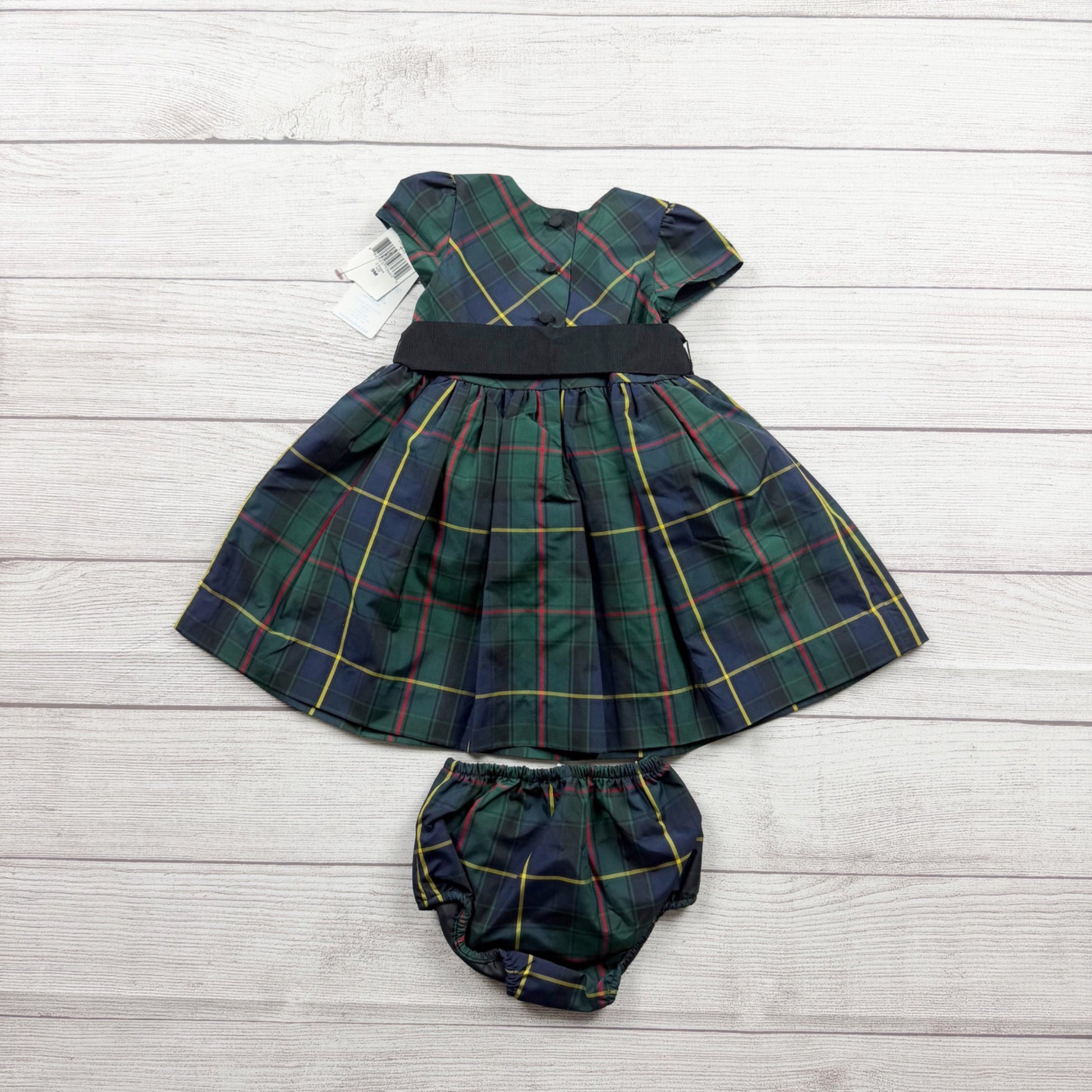 Ralph Lauren girls tartan plaid dress set in size 6-9 months featuring a classic green, navy, red, and yellow plaid pattern. This charming two-piece set includes a short-sleeve dress with puff sleeves, black satin waistband with bow, and matching tartan bloomers. Perfect for special occasions, holidays, family photos, and dressy events—a timeless preppy style.