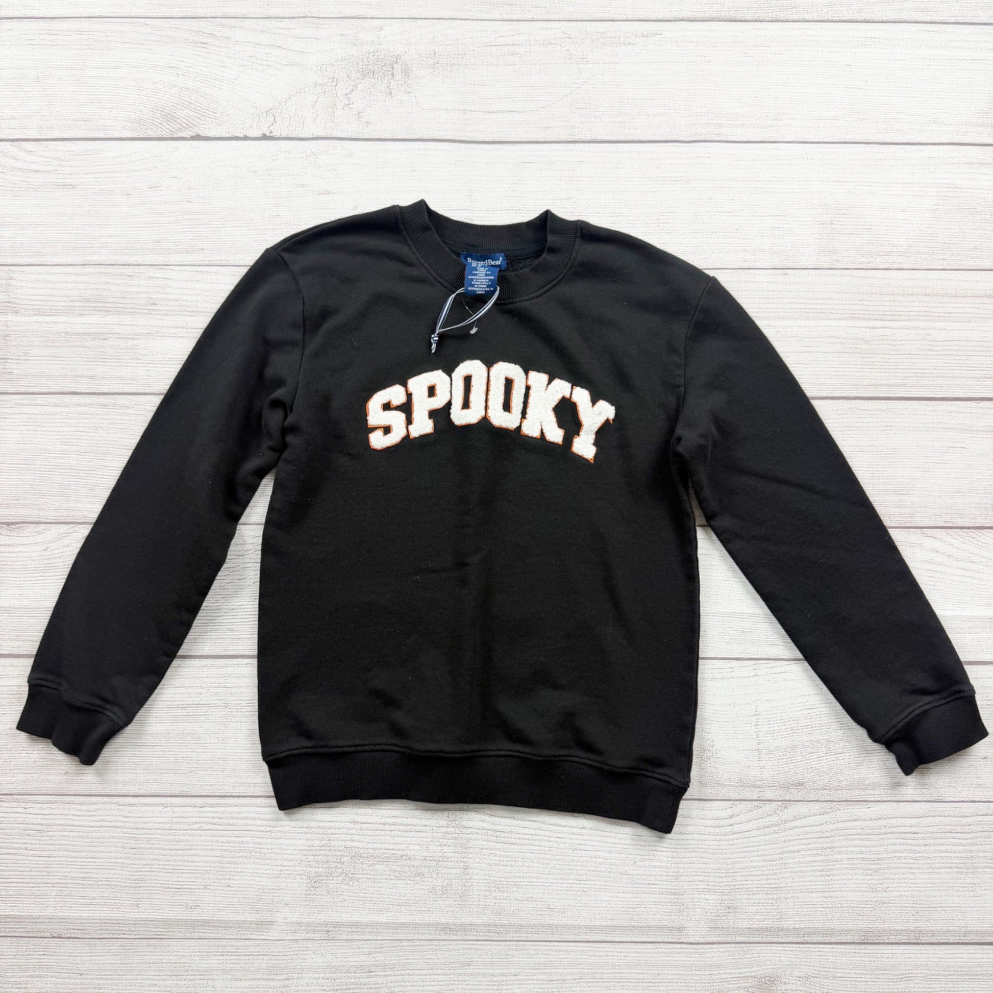 Rugged Bear kids crewneck sweatshirt in size M (10/12) in classic black. Features “Spooky” lettering across the chest in a varsity-style font with white and orange accents—perfect for Halloween season, fall outfits, and school spirit days. Soft, cozy feel with long sleeves and ribbed cuffs and hem. Fabric content is 62% cotton / 38% polyester (per tag).