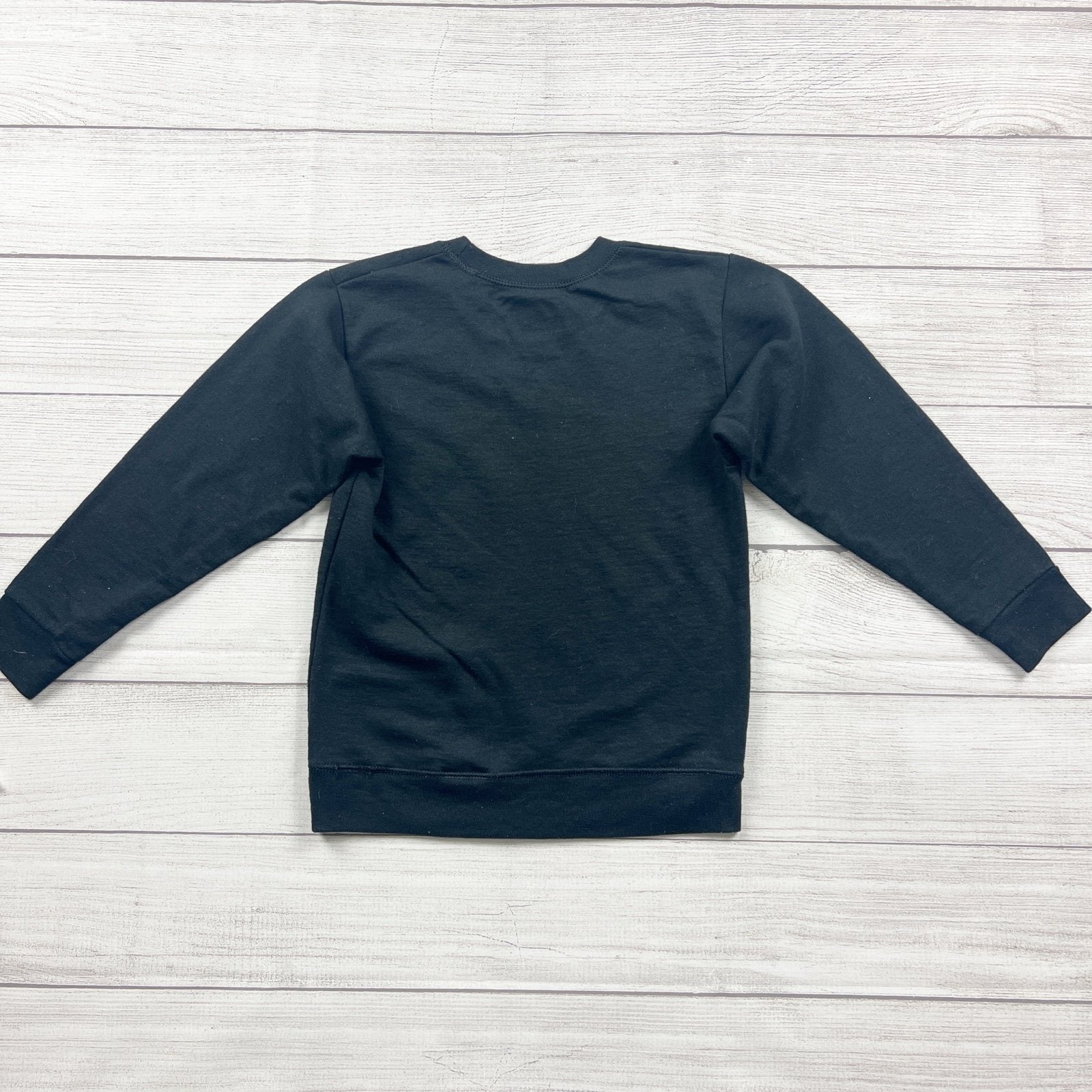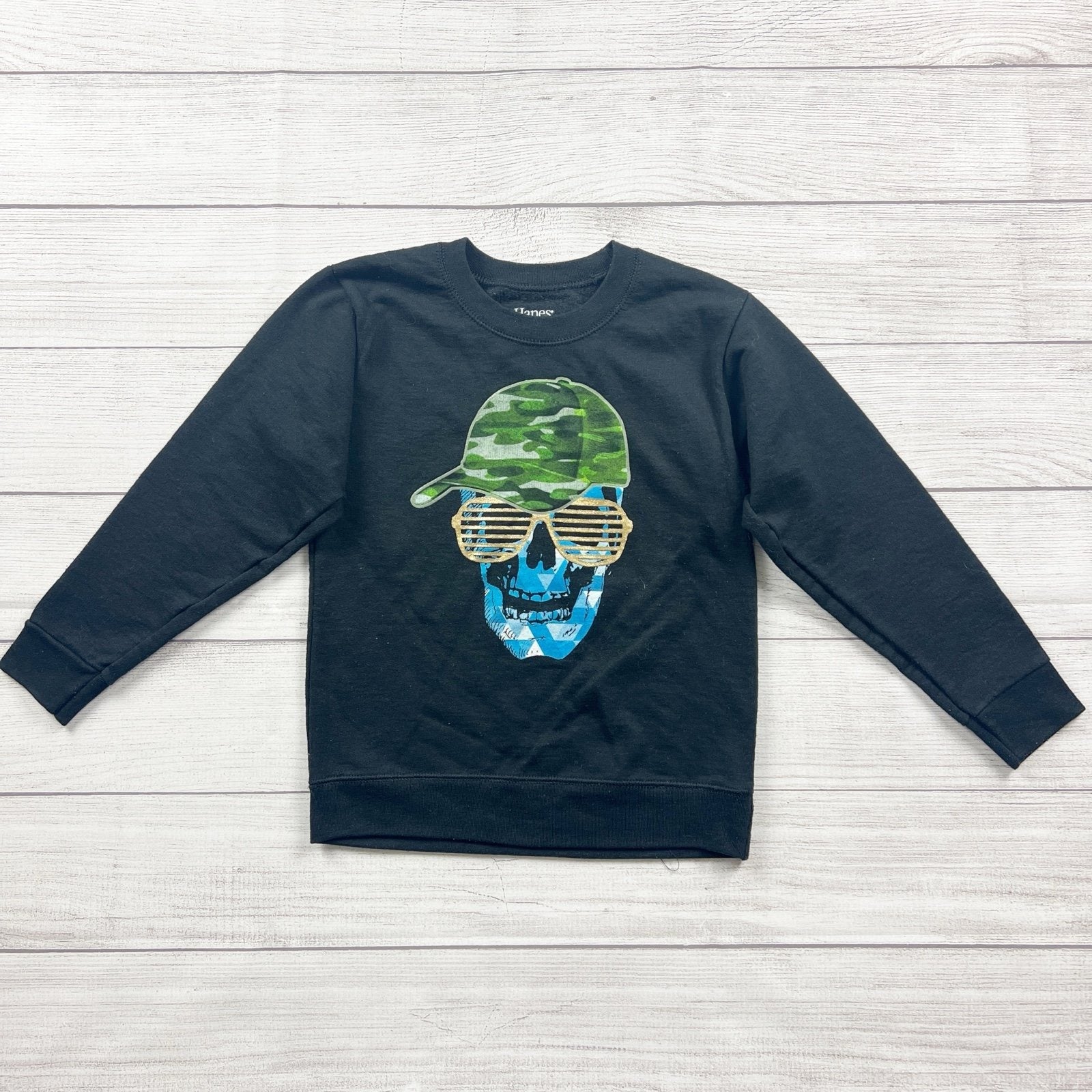Black long sleeve crewneck shirt with skull wearing sunglasses and camo hat. Polyester cotton blend