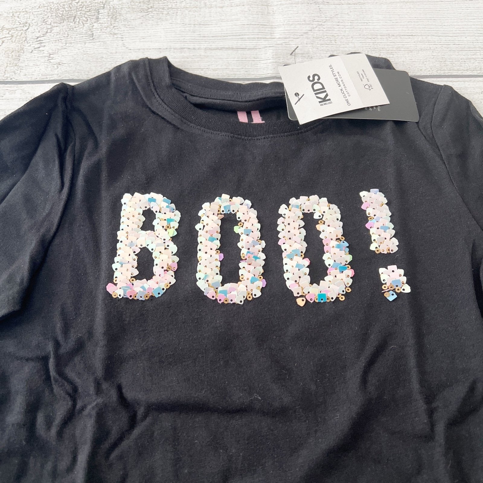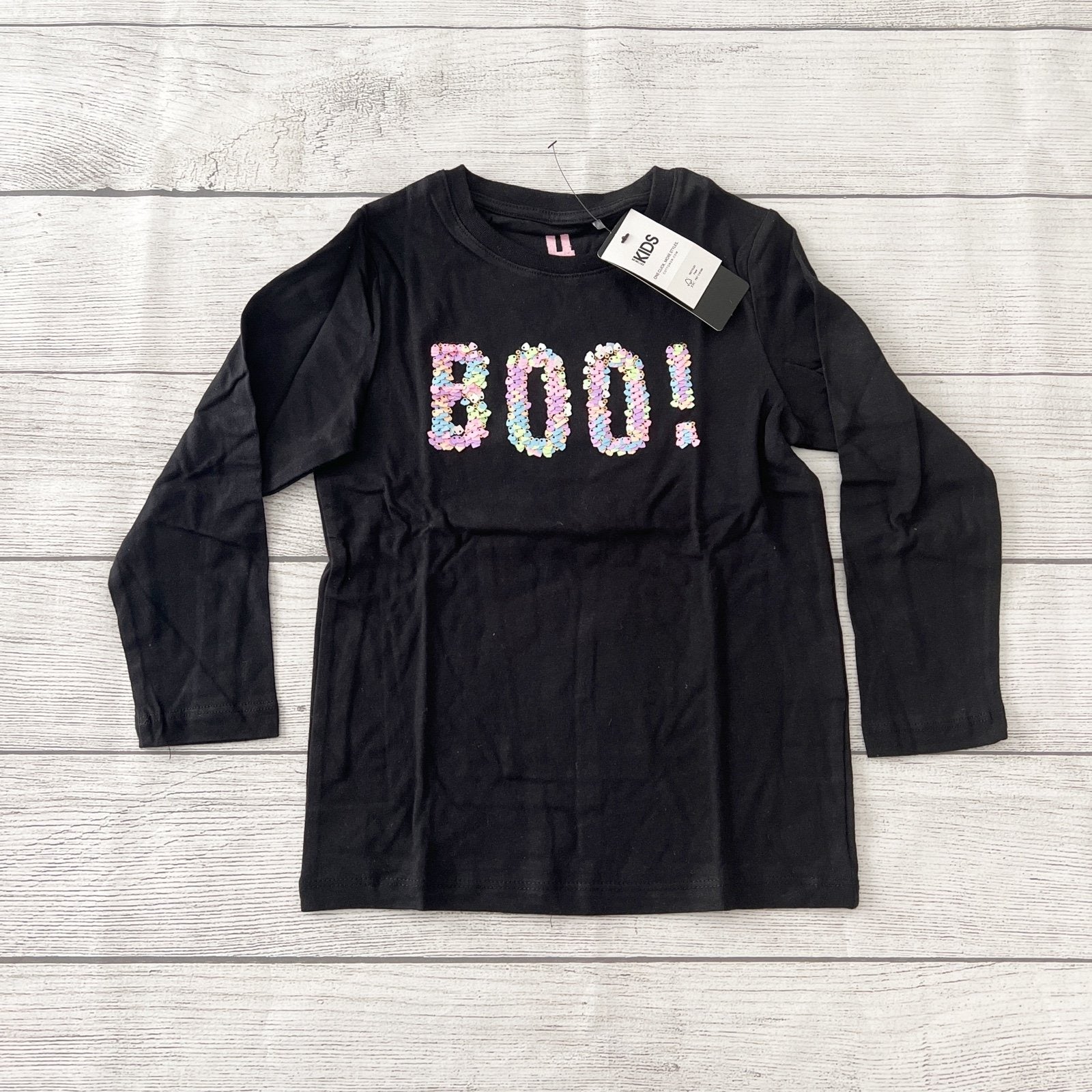 Black long sleeve shirt with “boo!” at chest in flip sequin. One side is colorful and the other side is silver.