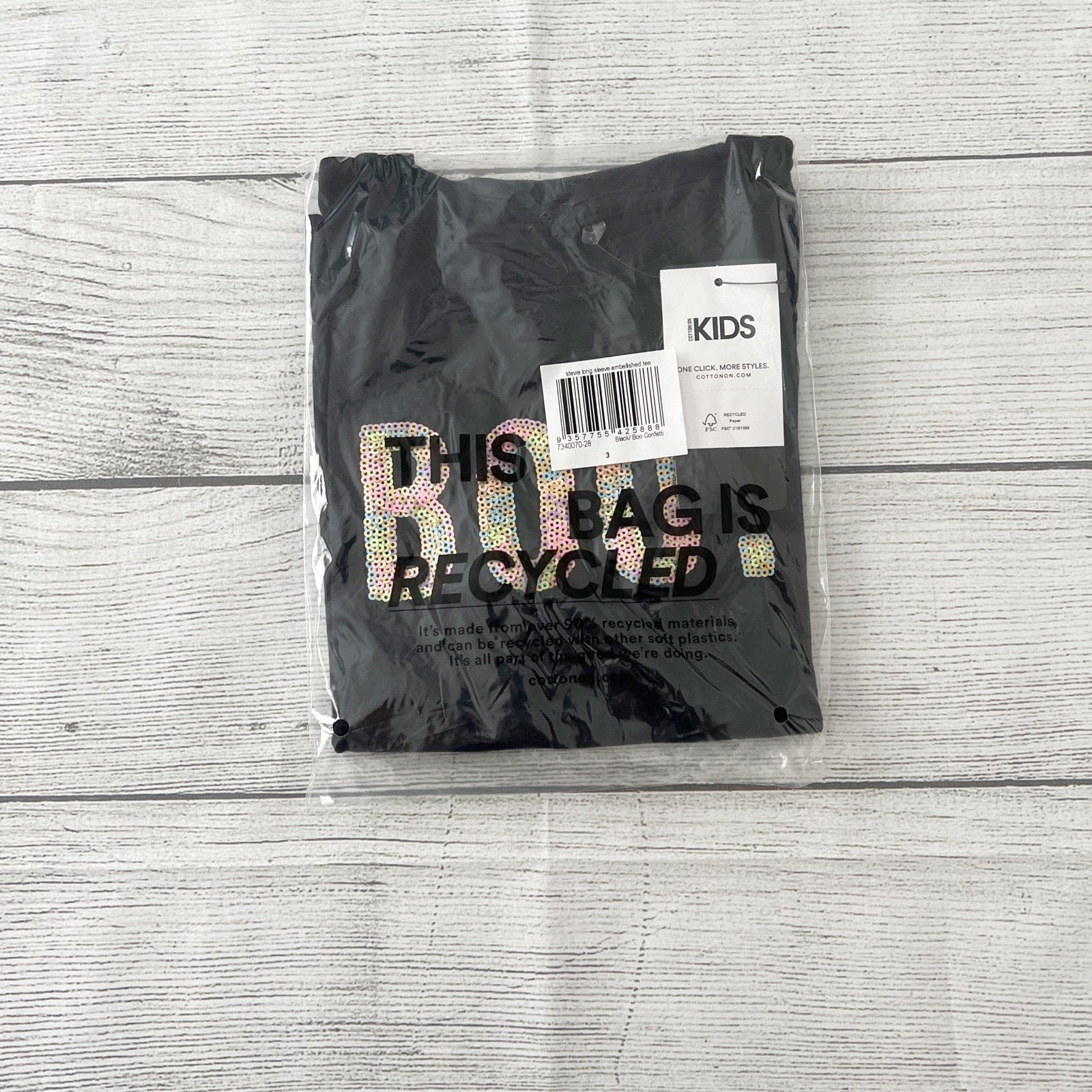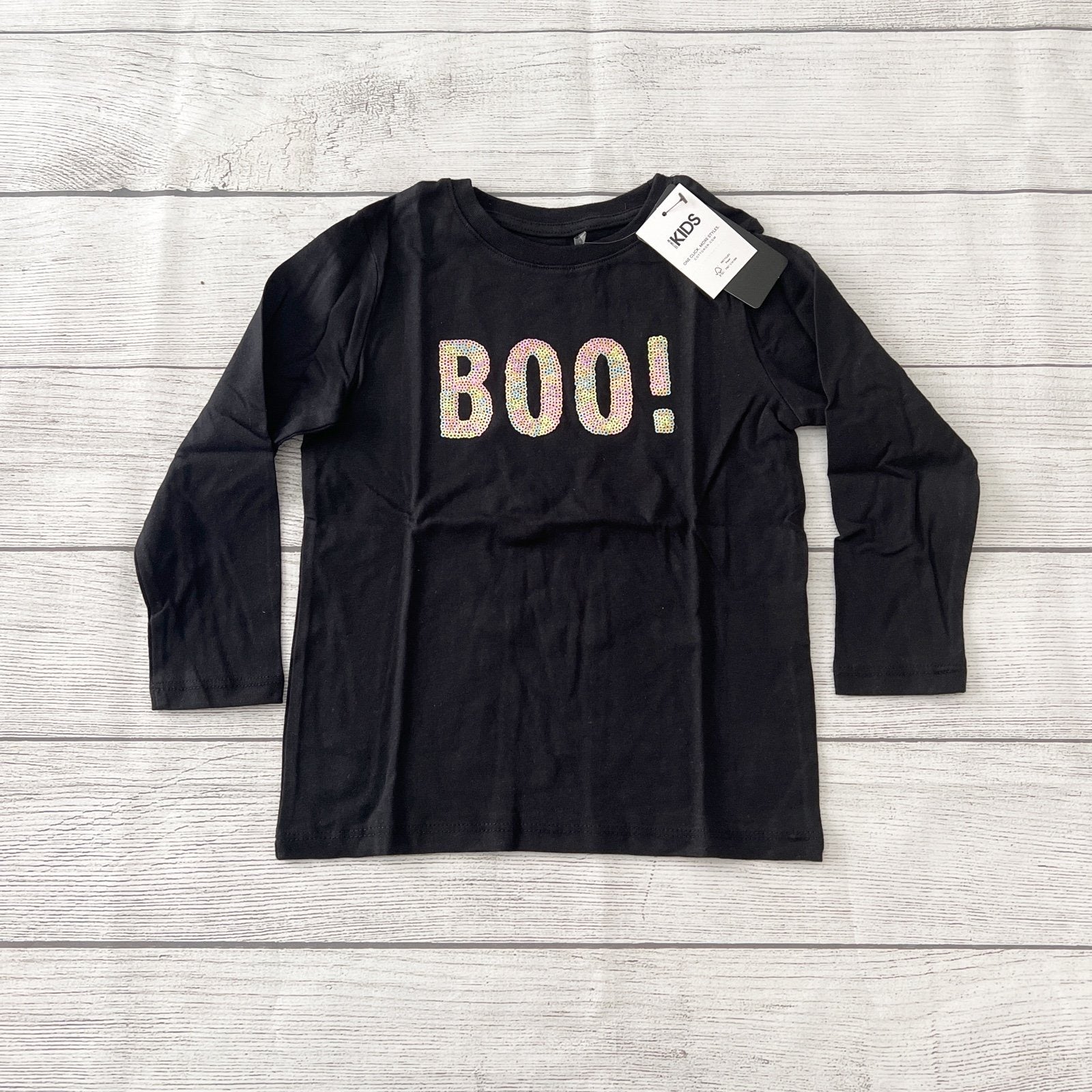 Black long sleeve shirt with “boo!” at chest in colorful sequins