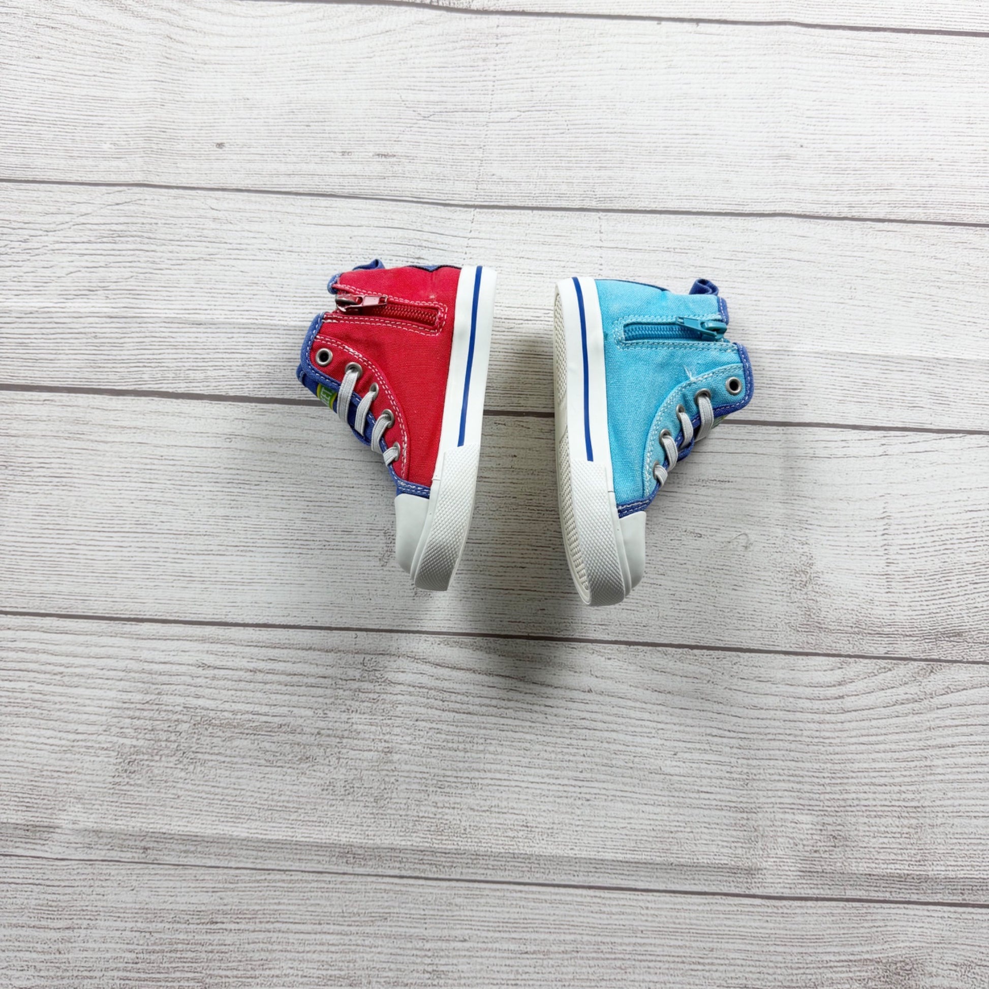 Sesame Street character high-top sneakers in size 7 toddler featuring beloved characters Cookie Monster and Elmo. These fun kids shoes showcase red and bright blue uppers with green character details, white laces, and a durable rubber sole. Perfect for toddlers who love Sesame Street—great for everyday play and adventures.