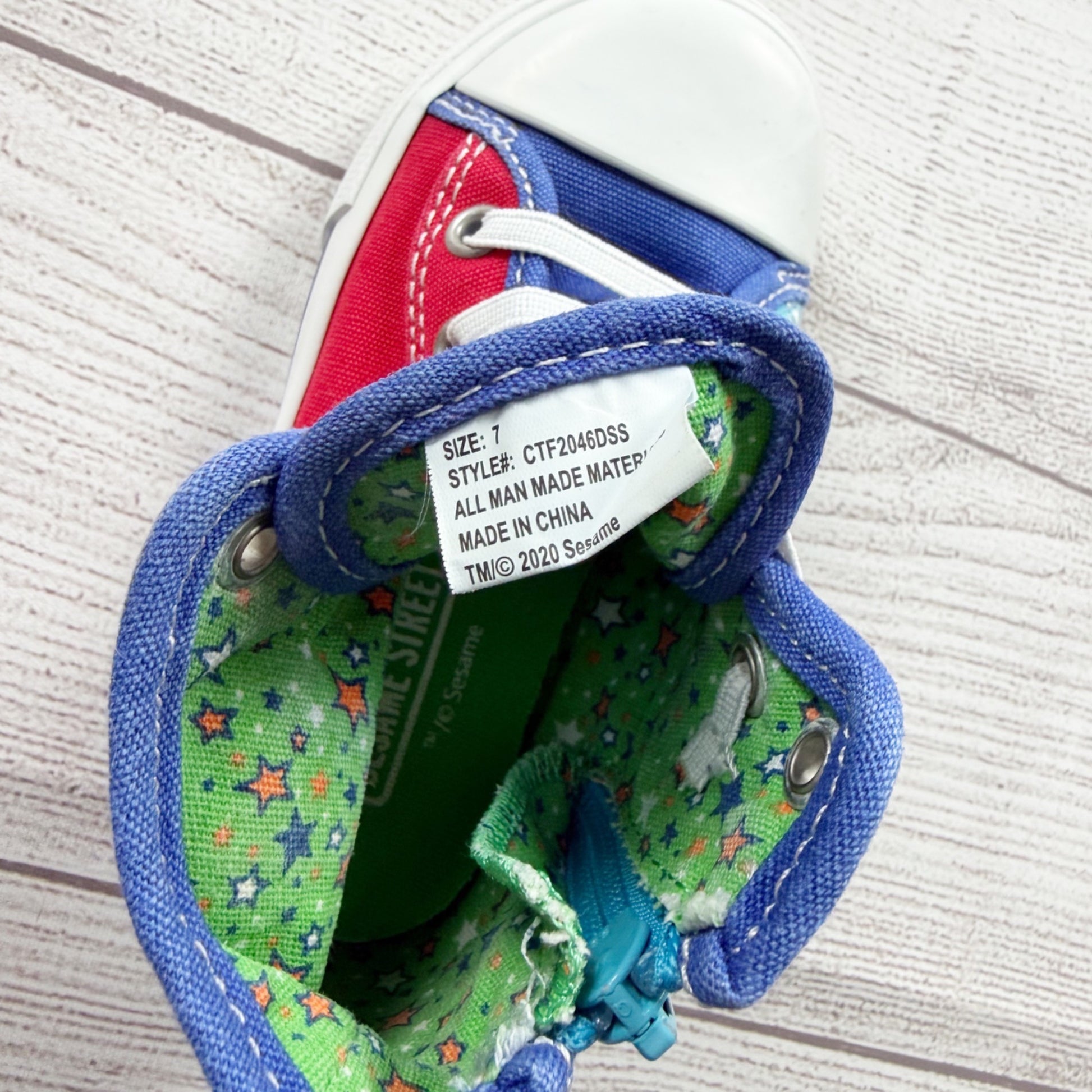 Sesame Street shoes, Sesame Street sneakers size 7 toddler, toddler character shoes, Cookie Monster Elmo shoes, high-top kids sneakers, Sesame Street kids shoes, character toddler shoes, lace-up kids sneakers, durable toddler shoes, everyday play shoes, gently used kids shoes, sustainable kids clothing, affordable character shoes, Thrifty Threads kids clothing